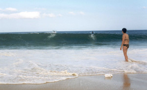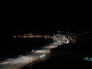 Udsigten fra hotellet var også meget malerisk efter mørkets frembrud. | Stranden lige uden for hotellet var dejlig, men vejret skiftede hurtigt i den uge vi var der. | Den ene dag helt fladt vand og den næste dag kunne der, som her være 5 - 7 m høje bøger. |