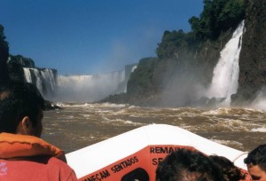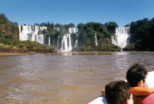 | Der er så meget vandsprøjt i luften at man skal have regntøj på for ikke at blive gennemblødt, men når der skal tages et rigtigt turistfoto, så er det af med jakkerne. | En tur i en gummibåd på floden er en fantastisk oplevelse. Der bliver udleveret plastikposer til fotografiapparaterne, når man sejler her så kommer vandet både oppe fra og nede fra. Vi havde vores gode danske regntøj på og var næsten tørre, da vi kom i land. Vandet og klipperne foran os kommer fra og er Argentina. | Det er voldsomt det vand der rammer en når det falder over 40 m. Dette billede er taget kort før, vi sejler ind under det vand, som kommer ned til højre i billedet. | Her er vi så i Argentina, hvor en stor del af vandet kommer fra. |