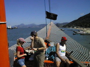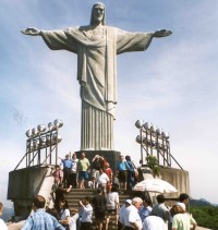 | Der var ikke morgenmad inkluderet på hotellet, vi fandt hurtigt en lille cafe, hvor vi både kunne få morgenmad og frokost til en fornuftig pris. | Den triste bagside af en ellers flot by, som Rio er slumkvartererne (Favelaerne), vi så dem kun som her på afstand. | Når man er i Rio, skal man selvfølgelig også op til Kristus statuen, som står på et lille bjerg i udkanten af byen og ser ud over Rio. | Fra Rio tog vi på krydstogt med et gammelt sejlskib til nogle tropeøer, som ligger ud for kysten et stykke syd for Rio. |