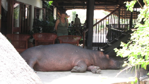Inden vi sejlede tilbage over floden, fik vi besked om, at der lå en flodhest oppe på terrassen, dvs den var gået nede fra vandet op ad en skråning + 10 trappetrin. Historien er, at Basil (flodhesten) blev jagtet af en anden flodhest op mod restauranten, Basil fortsatte igennem restauranten og her opdagede han så, at han ikke blev forfulgt mere. Den anden var stoppet 10 m fra restauranten. Siden da er Basil kommet og gået. Når han kommer, bliver der sat 3 kurvestole som skillevæg, så han ved at her til og ikke længere. Han ligger så her og nyder livet. Der er ingen, som giver ham noget af nogen slags.