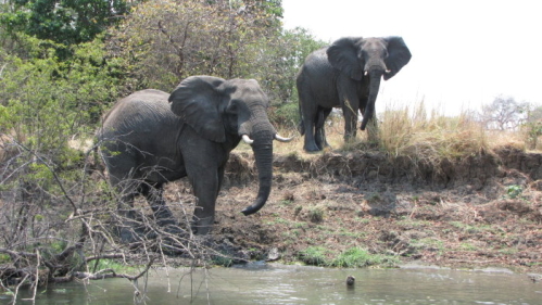 Vi blev kørt til en lodge, hvorefter vi igen ventede ca. 45 min. Nu blev vi så endelig sammen med en masse andre vist ned til 2 både og så gik turen så hen til et nyt sted, hvor vi skulle udfylde nye papirer for at komme ind i nationalparken. Hurra endelig safari. Der var flodheste, krokodiller, elefanter, aber og masser af fugle. Lige inden turen var slut, begyndte der pludselig at ske noget med elefanterne. De ville over på den anden side af floden, for der var græsset bedre. Der var over 40 elefanter, der gik over i mindre grupper. Nogle skulle lige bade og lege lidt undervejs. Det var en stor oplevelse.