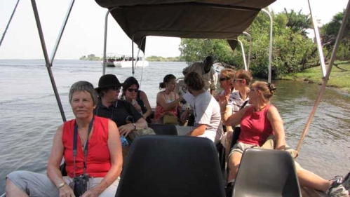 Torsdag skulle vi på safari i Botswana. Der kom en og hentede os kl. 6.45 og så gik turen til Kazungula, som er byen, hvor vi skulle med motorbåd over floden Zambezi. Inden da skulle vi udfylde papirer.. Motorbådsturen varede 5 min. På den anden side skulle vi hentes af et guidefirma. Vi var i god tid, så vi iagttog ”færgeoverfarten” og det satte mange tanker i gang. Lastbilerne holdt i lange køer på hver side af floden. Der kunne komme EN lastbil med hver gang. Ventetiden kunne let være på 2 til 3 dage og op helt til en uge. Der sejlede 3 pramme med et ”piskeris” på hver side. Det endte med, at vi ventede i ca. 1 time, ved flodbredden inden vi blev hentet. Men hvilken time, der var meget at se på. F.eks. var der alle dem, der transporterede benzin til Zambia. Kvinder og mænd slæbte benzin ombord på prammene. Prammen piskede stille ud midt i floden. Her blev dunkene løftet ned i nogle udhulede træstammer, indtil der var ca. 5 cm tilbage, inden vandet kom indenbords.