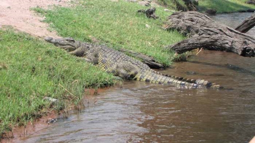 Flodvaranes værste fjende er nil-krokodillen. Vi har aldrig set så mange krokodiller før, som vi så på denne tur Hende her ligger og passer på sine æg. De var gravet ned i sandet ca. 4 m fra hende |