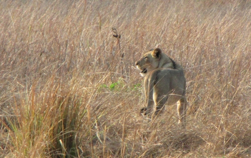 Mandag morgen op kl. 5 og på ny en morgentur. Vi så en masse forskellige fugle, 2 løver og nogle aber.