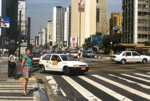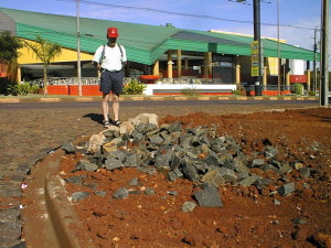| Landevejene i Brasilien er noget for sig selv, men det er et sted man skal undgå at gå for meget på alene, der er meget kriminalitet i Brasilien. Vi gik en tur og det gik godt. | Brosten i Brasilien er noget for sig selv. De er ikke regelmæssige som dem vi kender fra Danmark. Der er nærmest blot en gang brokker, det er utroligt at de kan komme til at ligge så pænt som dem her ved siden af Henning. | Turen sluttede i Sao Paulo. Det var 3 spændende uger. Sao Paulo er en kæmpe by, trafikken er så voldsom, at stort set alle gader er ensrettede, hver anden gade den ene vej og den næste gade den anden vej. Man kom faktisk hurtigere frem til fods end med bus. |