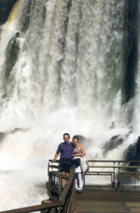 | Der er så meget vandsprøjt i luften at man skal have regntøj på for ikke at blive gennemblødt, men når der skal tages et rigtigt turistfoto, så er det af med jakkerne. | En tur i en gummibåd på floden er en fantastisk oplevelse. Der bliver udleveret plastikposer til fotografiapparaterne, når man sejler her så kommer vandet både oppe fra og nede fra. Vi havde vores gode danske regntøj på og var næsten tørre, da vi kom i land. Vandet og klipperne foran os kommer fra og er Argentina. | Det er voldsomt det vand der rammer en når det falder over 40 m. Dette billede er taget kort før, vi sejler ind under det vand, som kommer ned til højre i billedet. | Her er vi så i Argentina, hvor en stor del af vandet kommer fra. |
