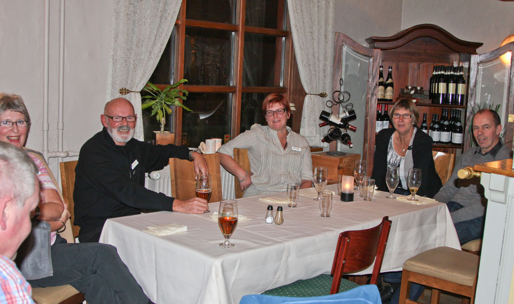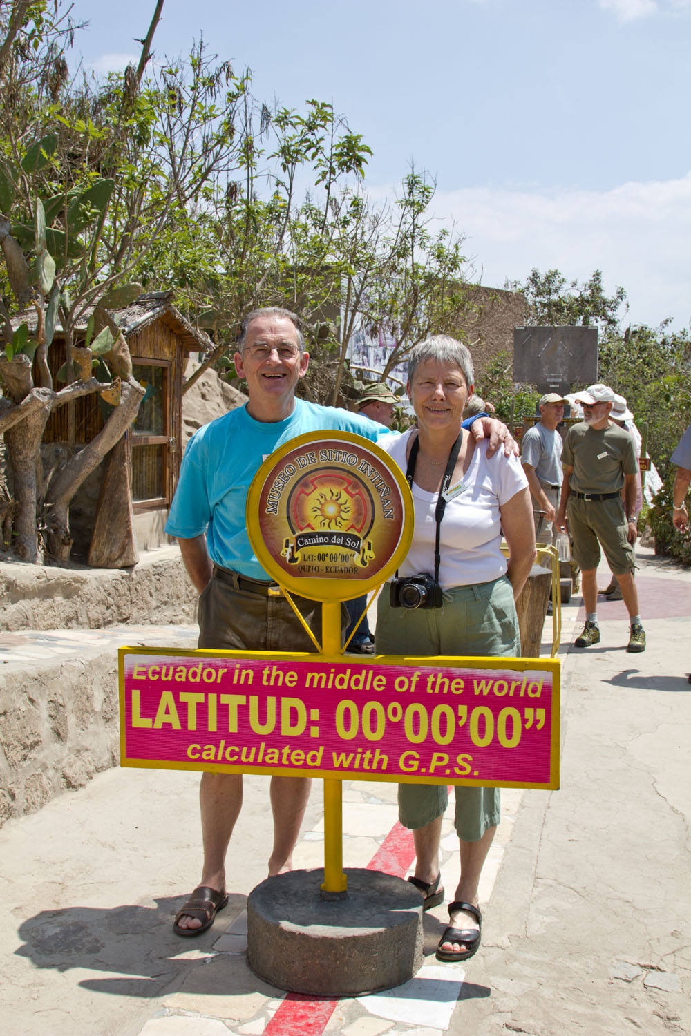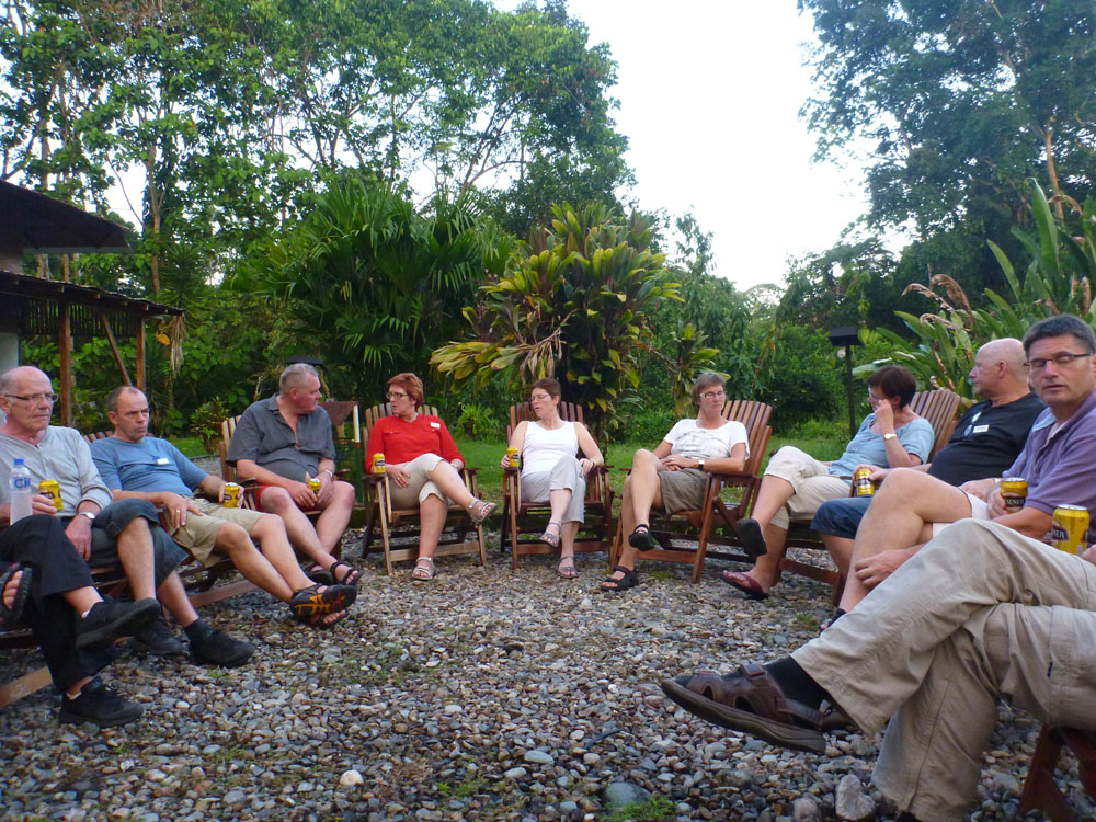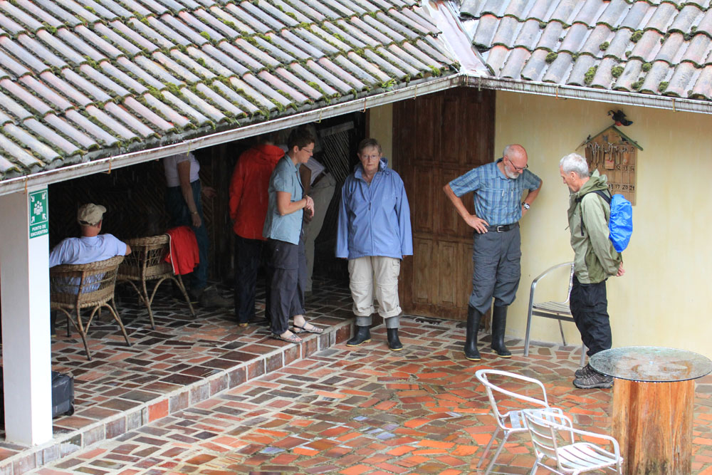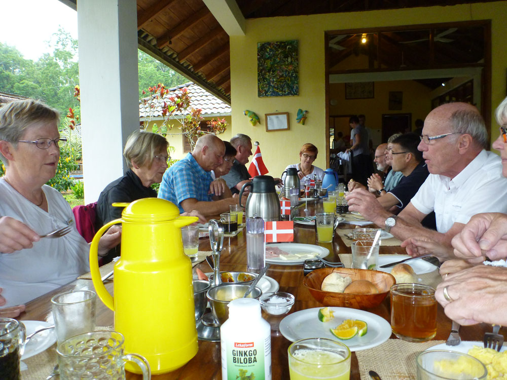| Torsdag 1. november. Vi var 13, som mødtes på Billund Kro for at overnatte og få lidt ekstra søvn, inden vi skulle meget tidligt op for at være i lufthavnen kl. 4.30. Her er det Rita, Hugo, Else Marie, Agnes og Svend Åge, der får en godnatdrink. Til venstre stikker Erik hovedet frem | Fredag 2. november. I Billund lufthavn fik vi vores egen skranke til at "checke in" ved, men det gik ikke hurtigere af den grund, tvært imod. De andre skranker var tomme længe før vores | Lørdag 3. november. Dagen begyndte med et besøg på Museo de Sitio Intinam, som ligger et sted, hvor Antonio de Ulloa i 1736 fandt ud af, at ækvatorlinjen går igennem |