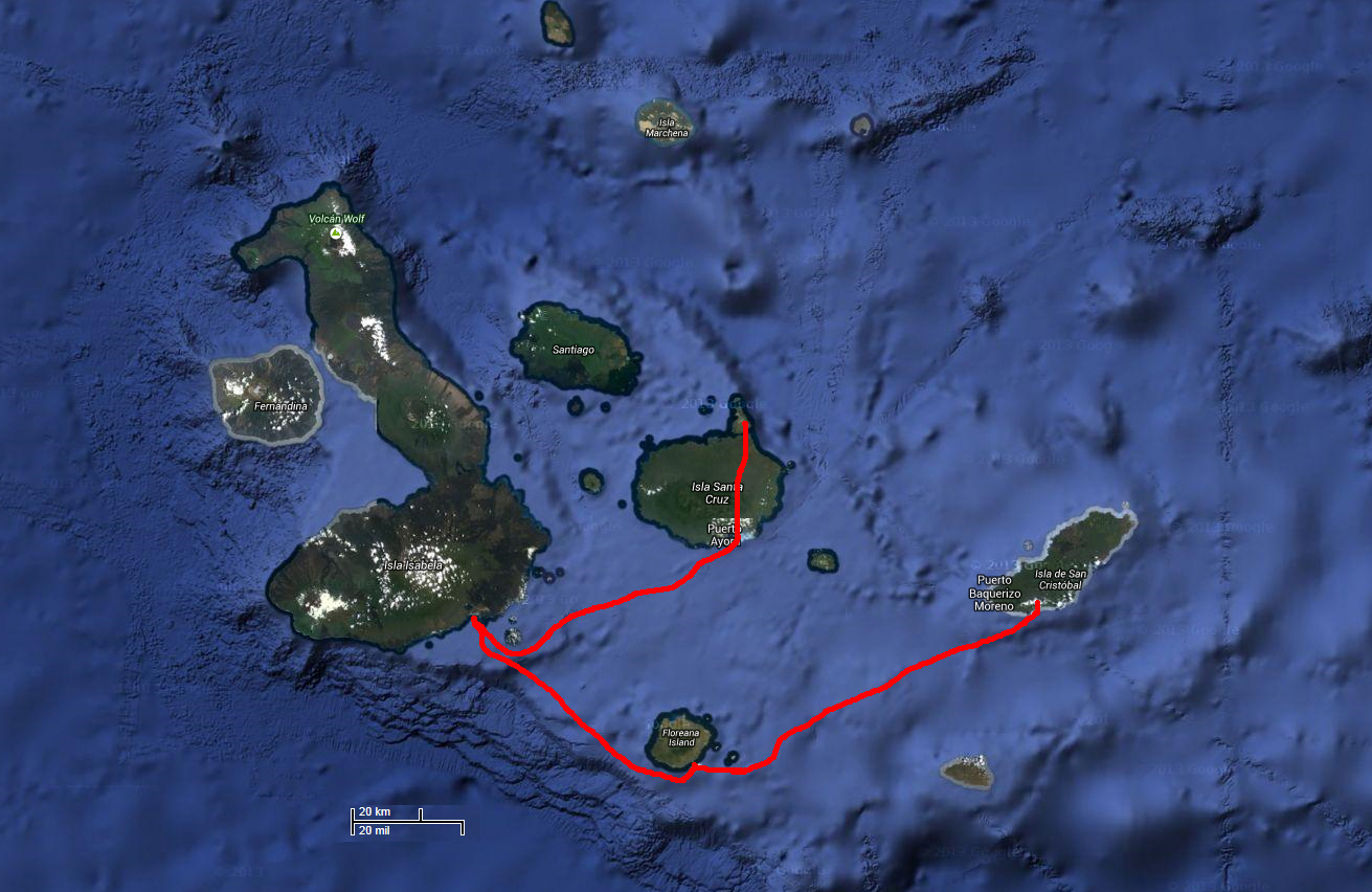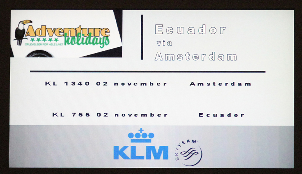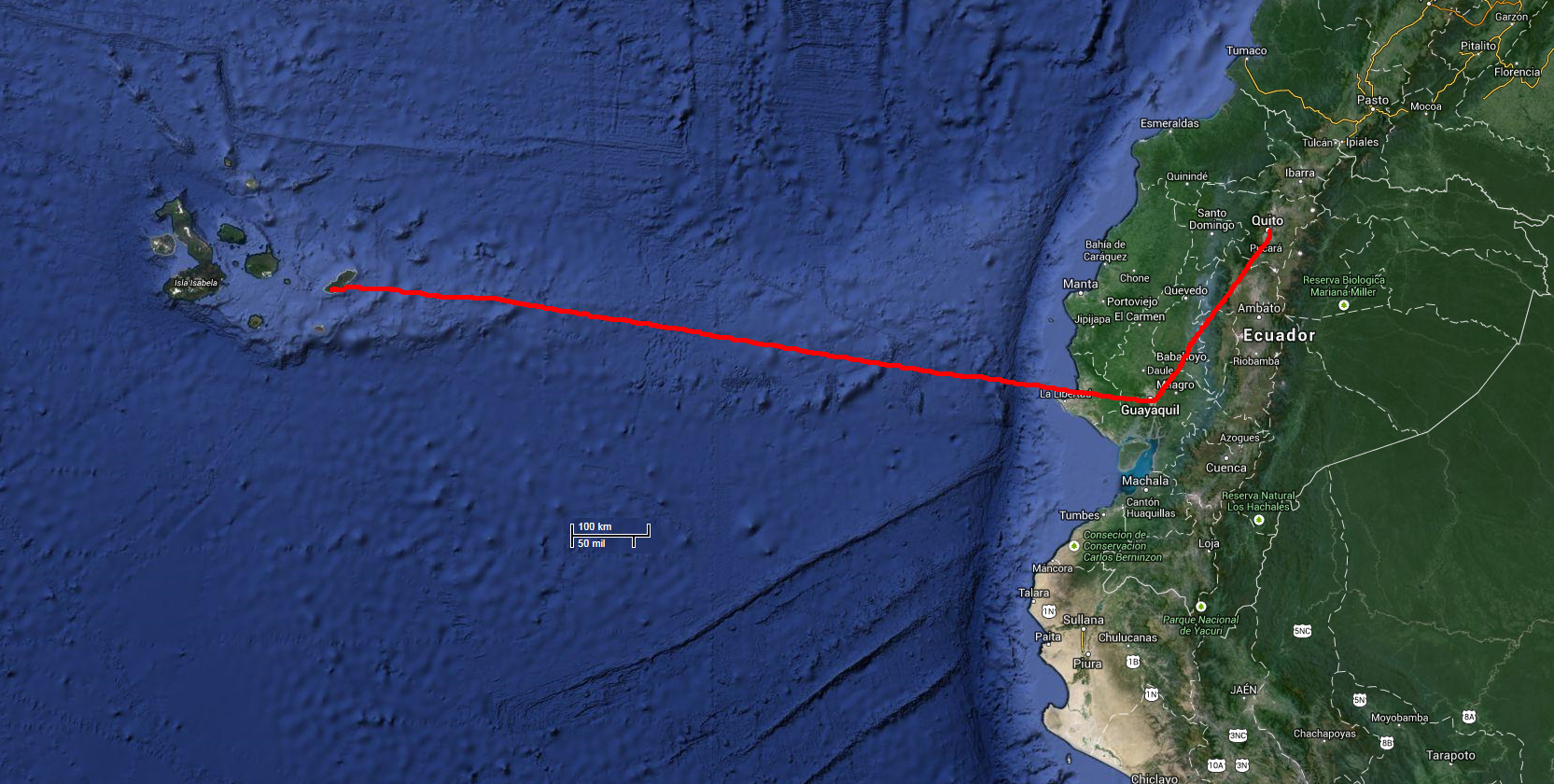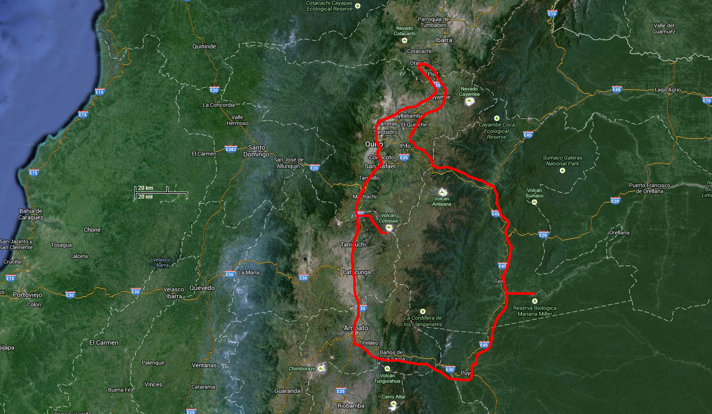 | Ruten gik Billund via Amsterdam til Quito i Ecuador | Køreruten rundt i Ecuador | Ruten Quito til San Cristobal, Galapagos |