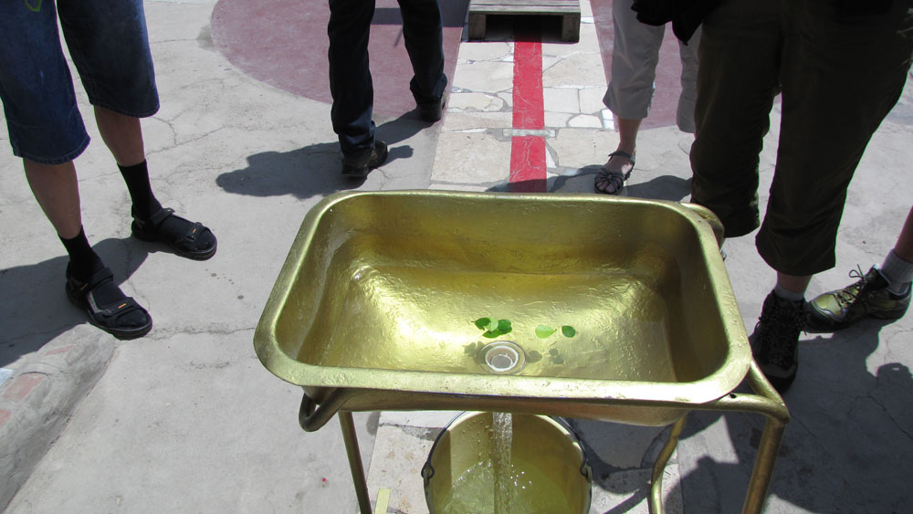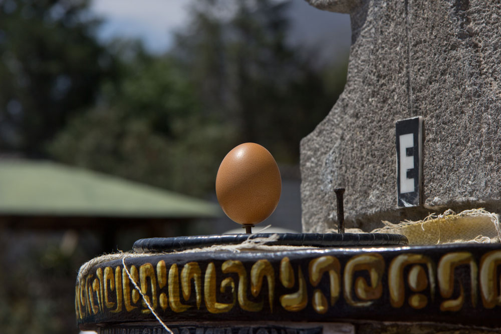 | En af dagens illusioner var, at når man stod på ækvatorlinjen, kunne man få et æg til at balancere på enden | Vi fik også forevist et fint illusionsnummer til demonstration af Corioliskraften. Der er bare det ved historien, at hvis han havde haft tre vandfade, hvor vandet havde fået lov at stå stille længe nok, var vandet løbet lige ud. Nu hældte han vandet i fadet i venstre side på den ene side af ækvatorlinjen og i højre side på den anden side, derved så det ud som om Corioliskraften har indvirkning på et vandfald | |