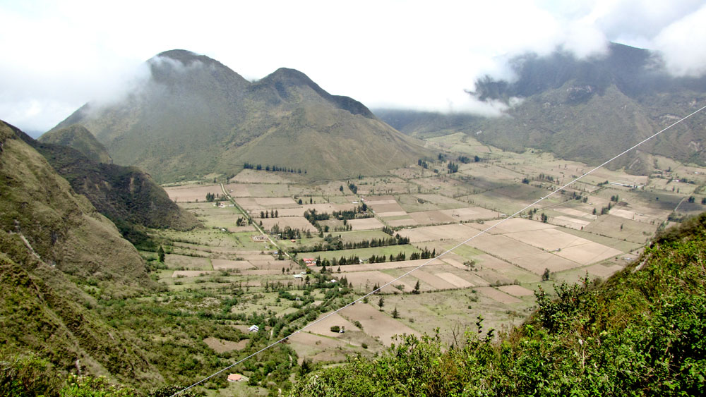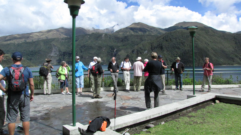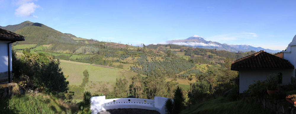 | På Casa Mojanda blev vi modtaget af indehaveren Betti | Søndag 11. november. Det var igen en fantastisk morgen. Fra Casa Mojanda havde vi en flot udsigt til vulkanen Cotocachi. Casa Mojanda ligger i 3.000 m højde, så når vi slæbte kufferter og i øvrigt gik i det kuperede område ved haciendaen, kunne vi godt mærke, at vi var oppe i den tynde luft | Udsigten til Laguna de Cuicocha |