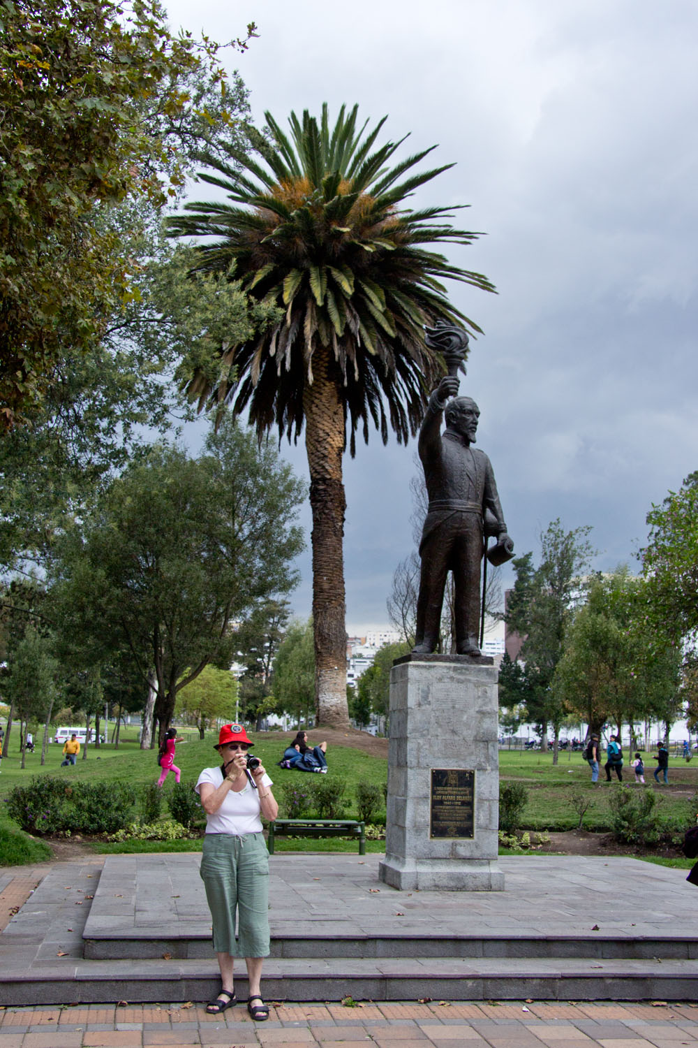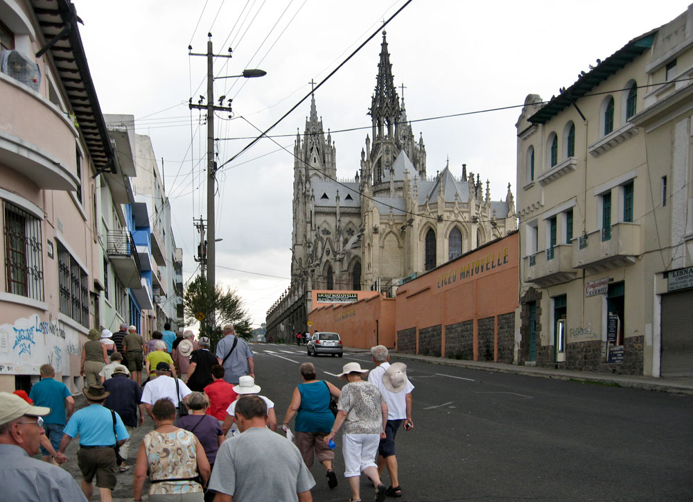 | Eloy Alfaro Delgado var præsident i Ecuador fra 1895 -1901. Som præsident arbejdede han meget for at svække katolikkernes magt, dvs. han arbejdede for at fjerne kirkens magt over samfundet, det var også ham, der var en kraftig forkæmper for, at Ecuador skulle være en selvstændig stat. Han blev dræbt i 1912 af prokatolske separatister | Da vi kom til Basilica del Voto Nacional, kunne vi desværre ikke få lov at komme ind. Basilikaen er en ny kirken, dvs. der bygges stadig på den, det ses bl.a. udvendig, hvor en del af den planlagte udsmykning endnu ikke er kommet op. Måske bliver Basilikaen aldrig færdig, en lokal legende fortæller, at den dag Basilikaen bliver færdig, går jorden under |