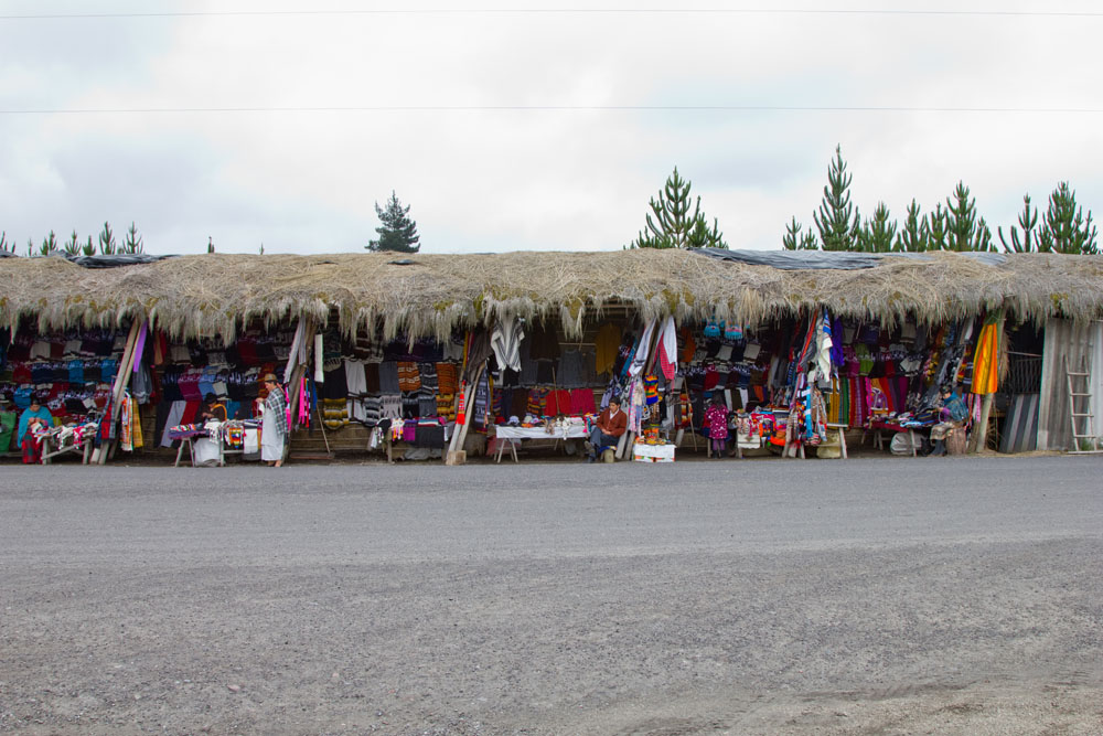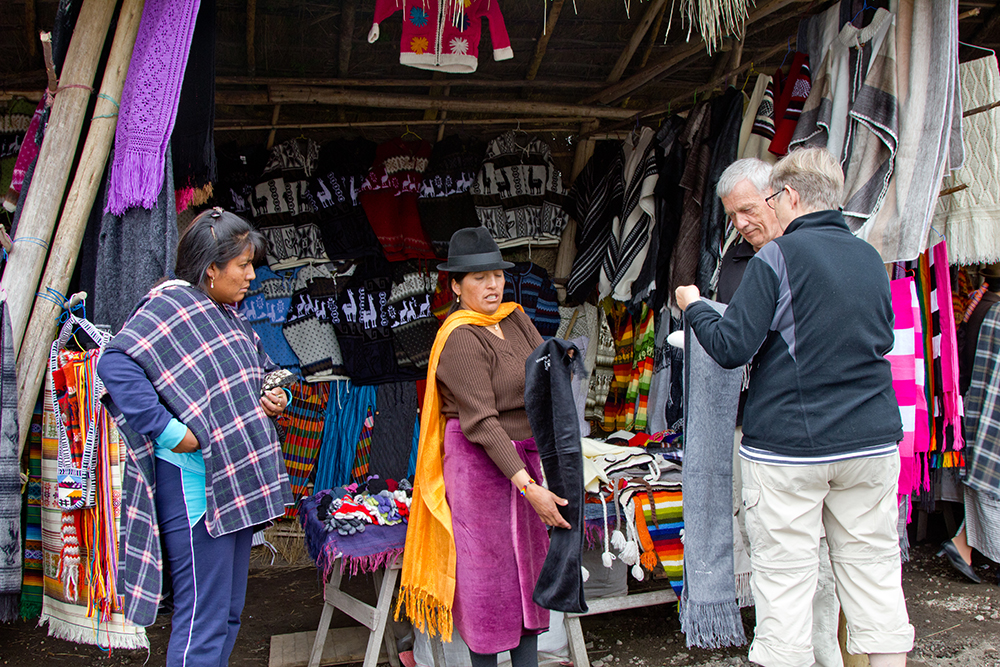 | Da vi vandrede op i en af gaderne, blev vi "overfaldet" af gadesælgere, så gik der shopping i den. Det var navnlig de små billeder, der er malet på gedeskind, der var gang i | Søndag 4. november. Ved indkørslen til Cotopaxi nationalparken var der et af de obligatoriske markeder med lokalt håndarbejde. Det er koldt oppe i 3.000 m højde, så der var et stort udbud af strikkede handsker, strikkede huer og tørklæder |
