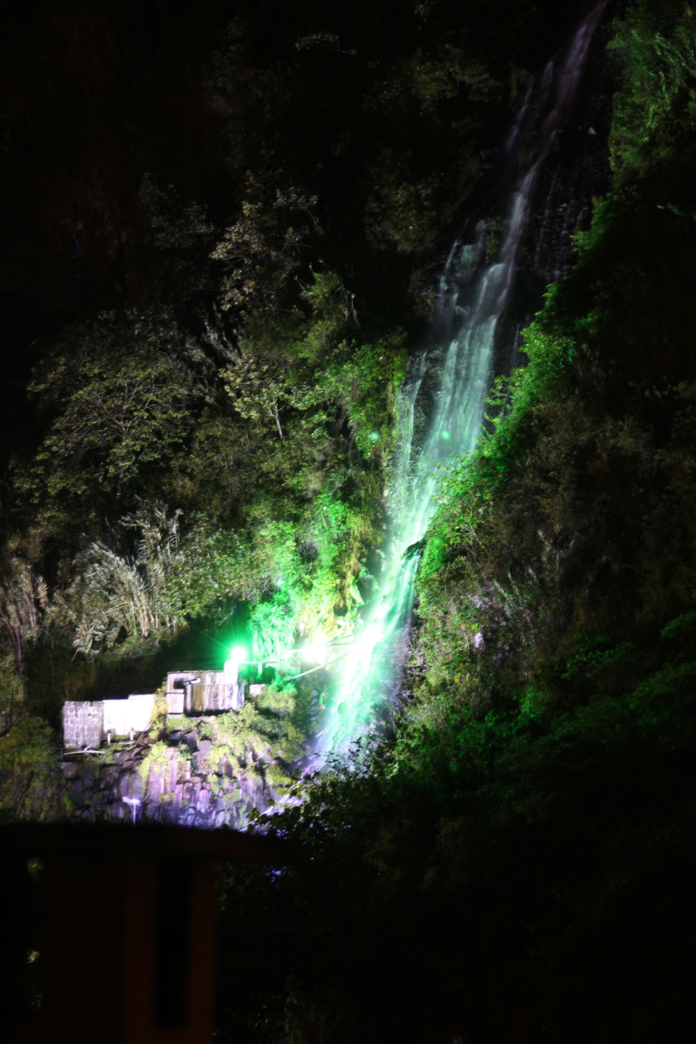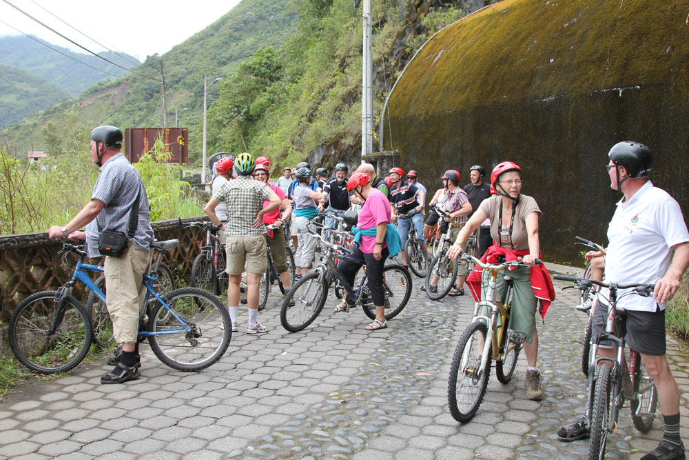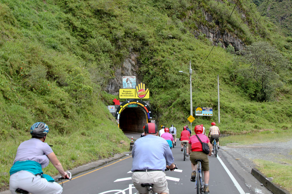 | Mandag 5. november. Cykletur på Avenida de Cascadas - "Vandfaldenes avenue" | Som regel kunne vi følge den gamle vej, som oprindelig havde snoet sig langs bjergsiden, men en enkelt gang blev vi nød til at køre igennem en af tunnelerne. Vi fik da ordre på at brede ud, så vi spærrede for al anden trafik, mens vi var inde i tunnelen | Vi stoppede flere gange og nød udsigten over floden og alle de små vandfald, der dukkede op på bjergesiderne på den anden side af floden |