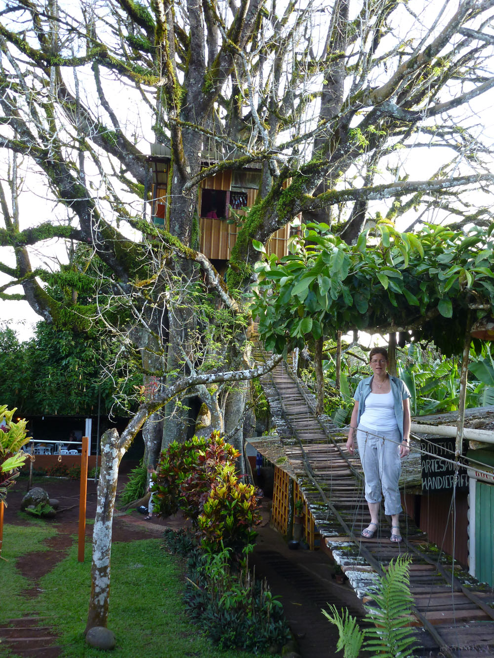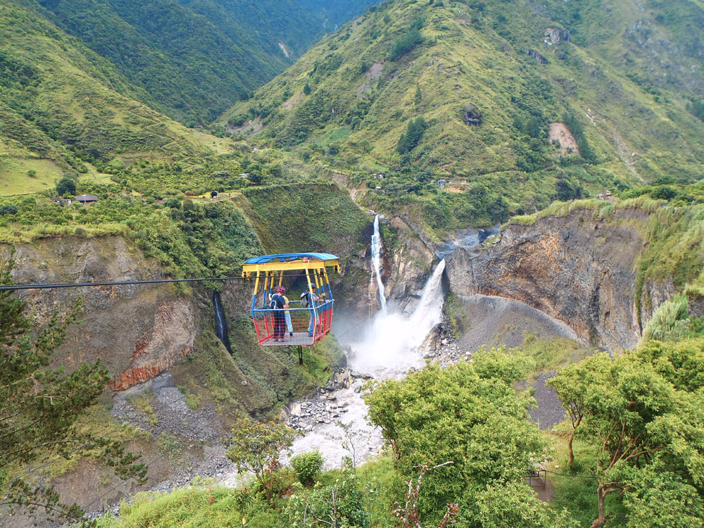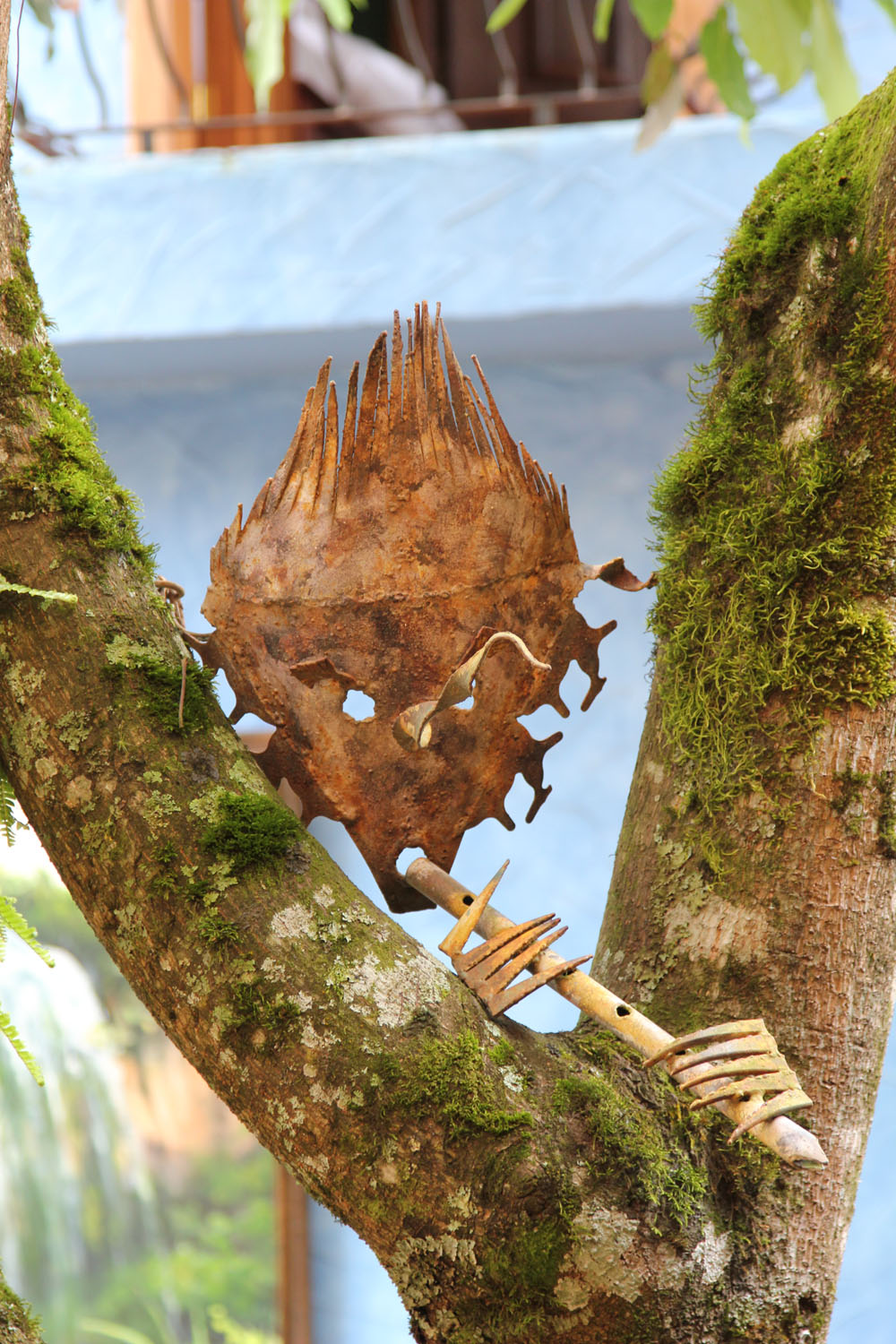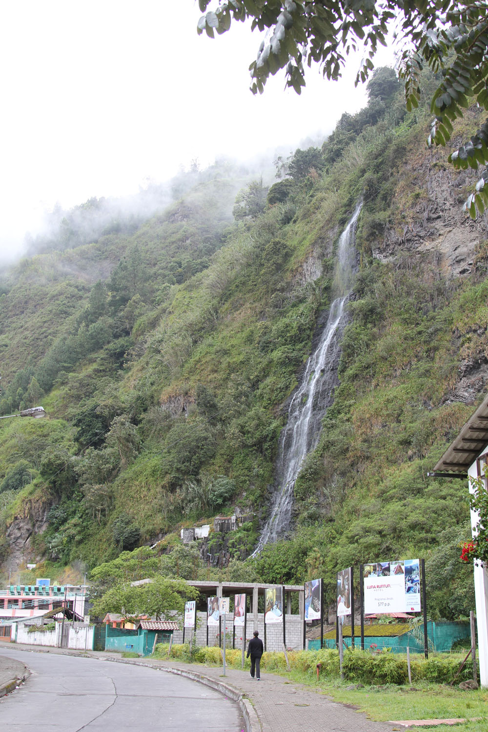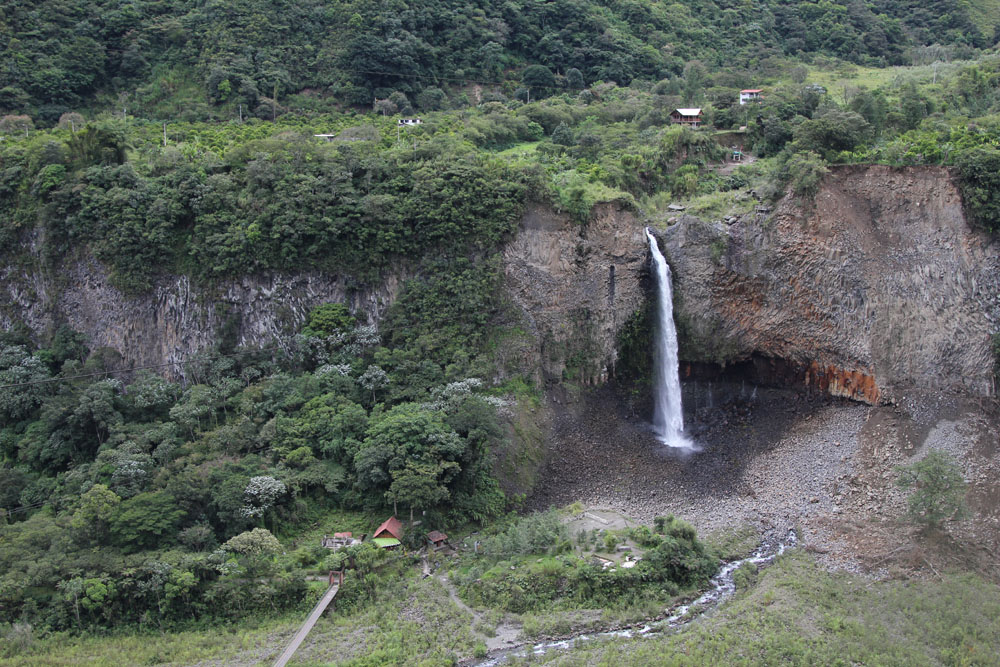 | Vandfaldet i Baños i dagslys, den næste morgen | Haciendaen i Baños, hvor vi blev indkvarteret var et hyggeligt hotel med det klingende navn La Posada Del Arte | Navnet La Posada Del Arte kommer af at ejerne udsmykkede haciendaen med alle mulige forskellige kunstværker, her er det en skovtrold i et træ i haven |