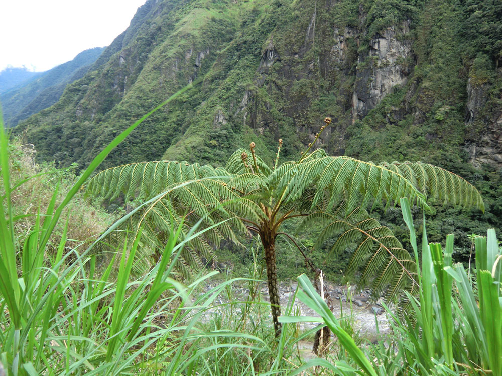 | Flere steder gik der kabelbaner hen over floden. Kabelbanerne blev brugt af bønderne på den anden side af floden, til at bringe deres produkter over til vejen og dermed videre til markedet | Langs vejen så vi bl.a. store trælignende bregner | Et stop på den gamle vej ved siden af en biltunnel |