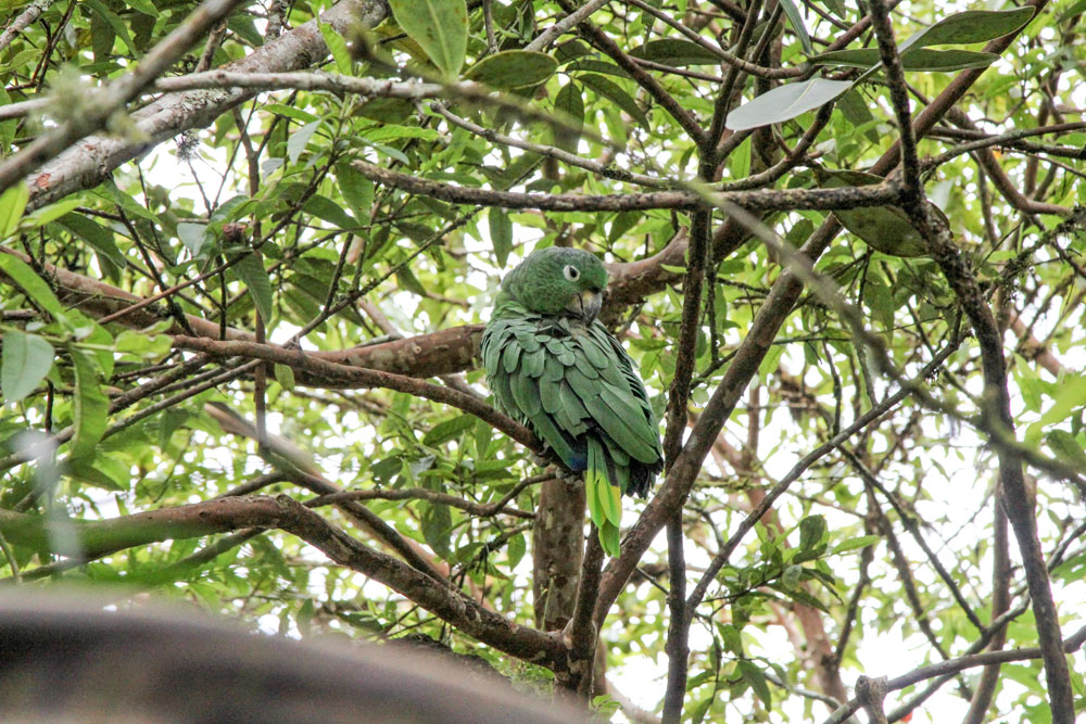 | Vi ankom til Rio Verde og Restaurante El Maito præcis kl. 12, vi havde da cyklet ca. 16 km og var kørt fra en højde på ca. 1.800 m ned til ca. 1.500 m | I haven til restauranten var der amazonpapegøjer i træerne og mange forskellige orkideer. Papegøjen var en Mealy Amazon - Amazona farinosa | |
