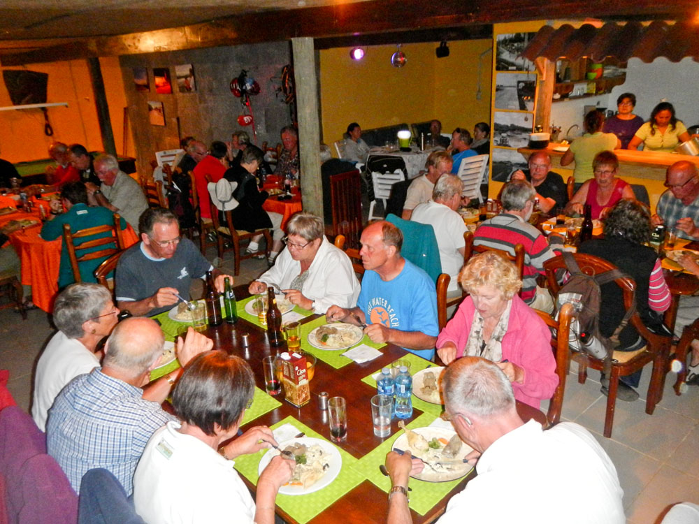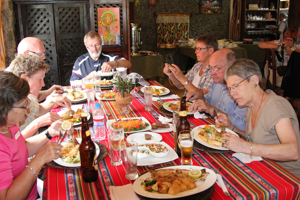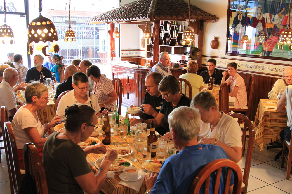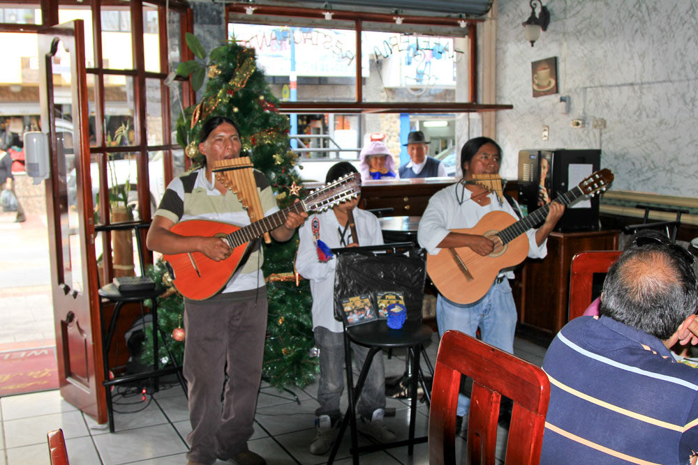 | Fra lagunen gik turen til Cotacachi by, hvor vi kunne gå på indkøb inden frokosten | Frokosten blev indtaget i restaurant La Marquesa. Her var bl.a. underholdning til maden af et lokalt band | Som tidligere nævnt spiser man mange marsvin i Ecuador |