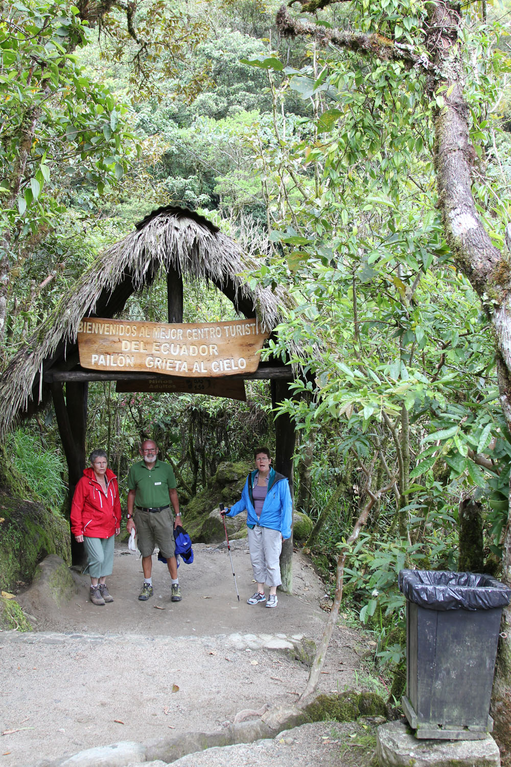 | Flot orkide i restaurantens have | Forretten var kartoffelsuppe. Hovedretten var stegt ørred med ris og desserten var citronfromage med jordbær | Efter frokosten vandrede vi ud til Djævlens gryde - Pailon del Diablo, det var et vandfald, hvor vi kunne komme ind bag vandet, der styrtede ned |