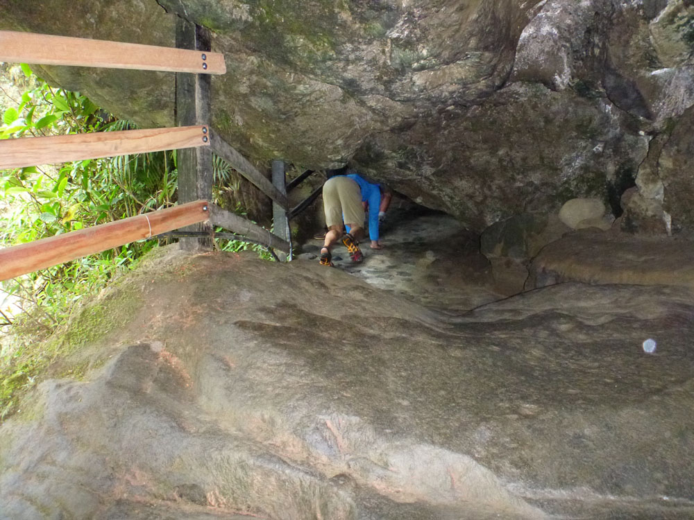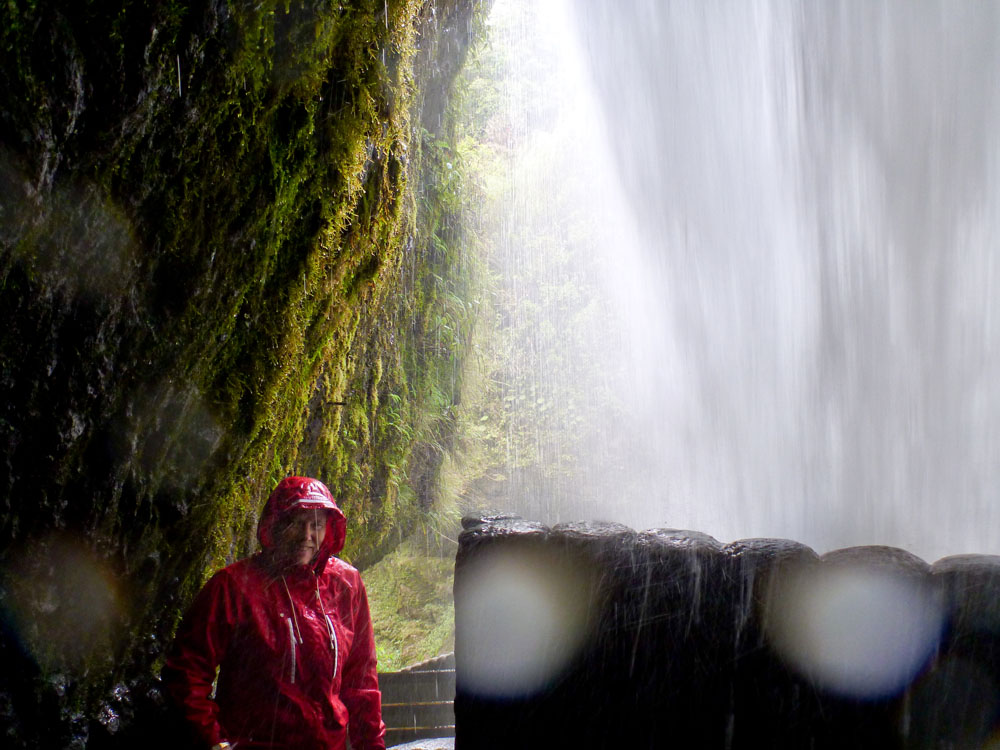 | Djævlens gryde - Pailon del Diablo | Man måtte ikke lide af klaustrofobi, hvis man ville op bag vandfaldet | Selv med et godt sæt regntøj blev man våd oppe under vandfaldet, her er det Vibeke, der bliver våd |