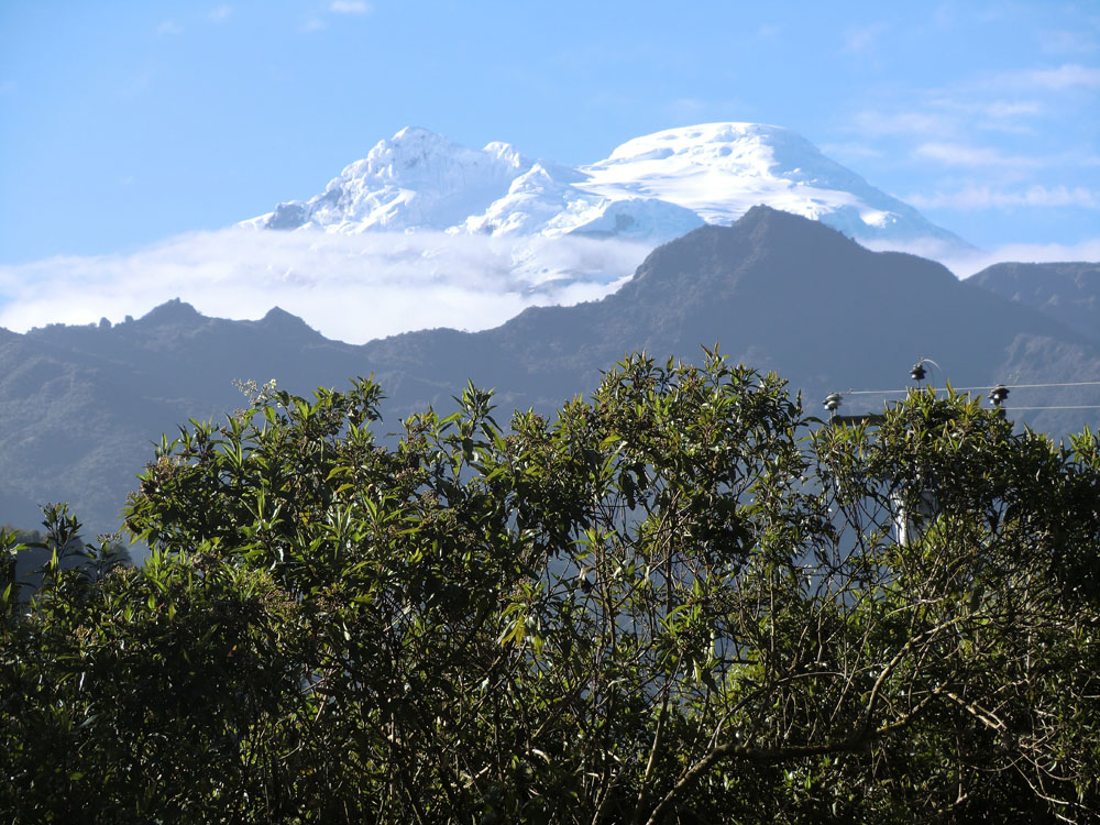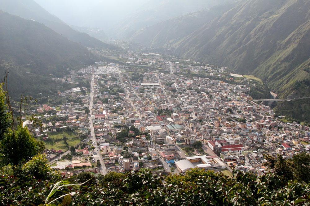 | Fra korset Mirador La Cruz Bellavista i en højde af 2.100 m over havet, var der en flot udsigt ned over Baños | På bjergskåningen oppe ved korset var der en "tomattræs"-plantage. "Tomaterne" havde et kraftig skind, når man forsøgte at spise dem, var de meget bitre, men kom man lidt salt på dem, kom de til at smage fuldstændig som tomater, når man altså nøjedes med at spise kødet inden i frugten |