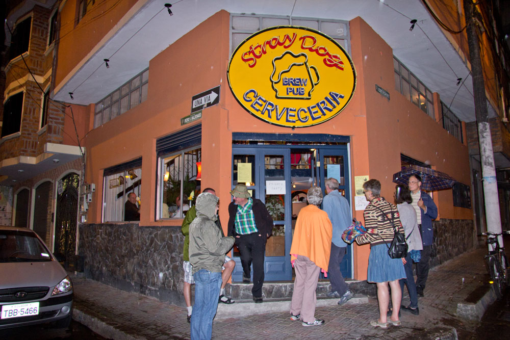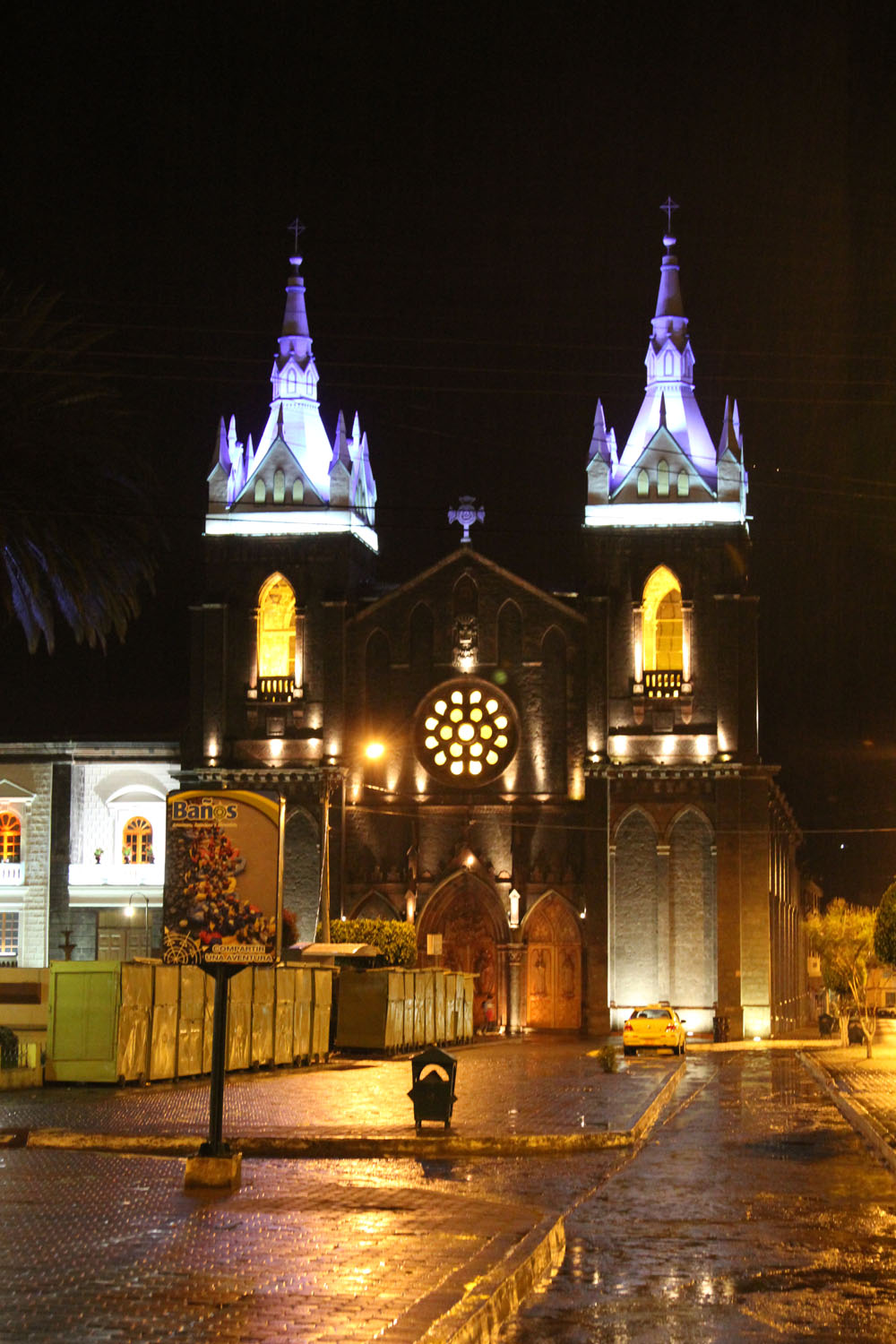 | Korset Mirador La Cruz Bellavista | Sønnerne og manden, som ejede det hotel, vi boede på, havde et minibryggeri med tilhørende "beer pub". De bryggede fire slag øl. JPA Ale, Irish Red, Stout Stray Doug og en ufiltreret Gold Pilsner | Katedralen i Banõs ved nattetide |