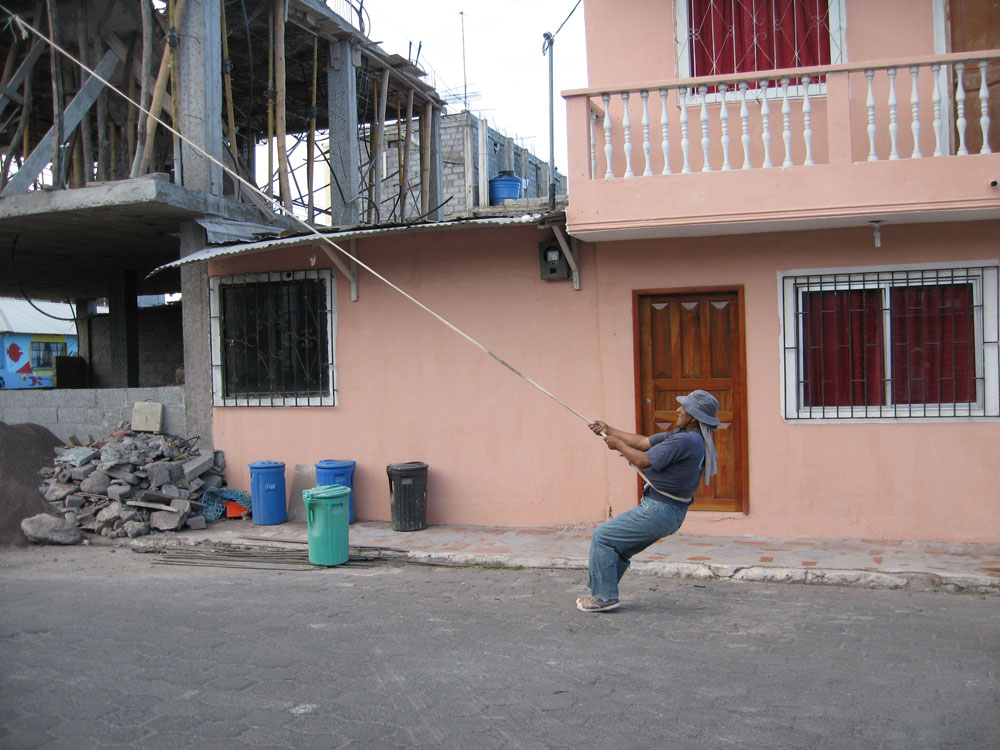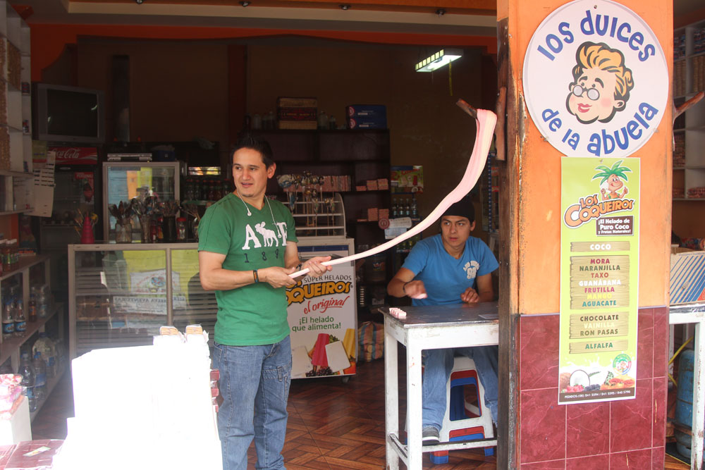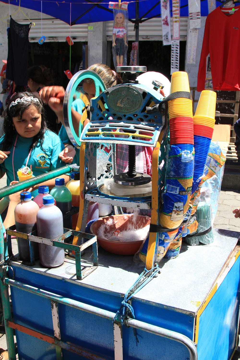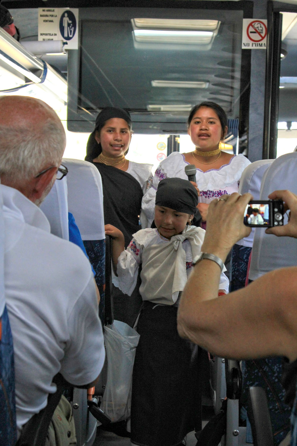 | En rigtig sælger, han var rigtig god til at sælge secundavarer | Nogle lokale piger, som skulle til Otavalo, gjorde sig gode venner med vores guider, så det endte med, at de fik et lift med bussen videre til markedet | I Otavalo traf vi bl.a. damen med "slush maskinen" Maskinen var et håndsving som fil en almindelig isblok til at rotere oven på et rivejern, under rivejernet stod en skål til den revne is. Isen kom derpå i et bæger sammen med frugtsaft |