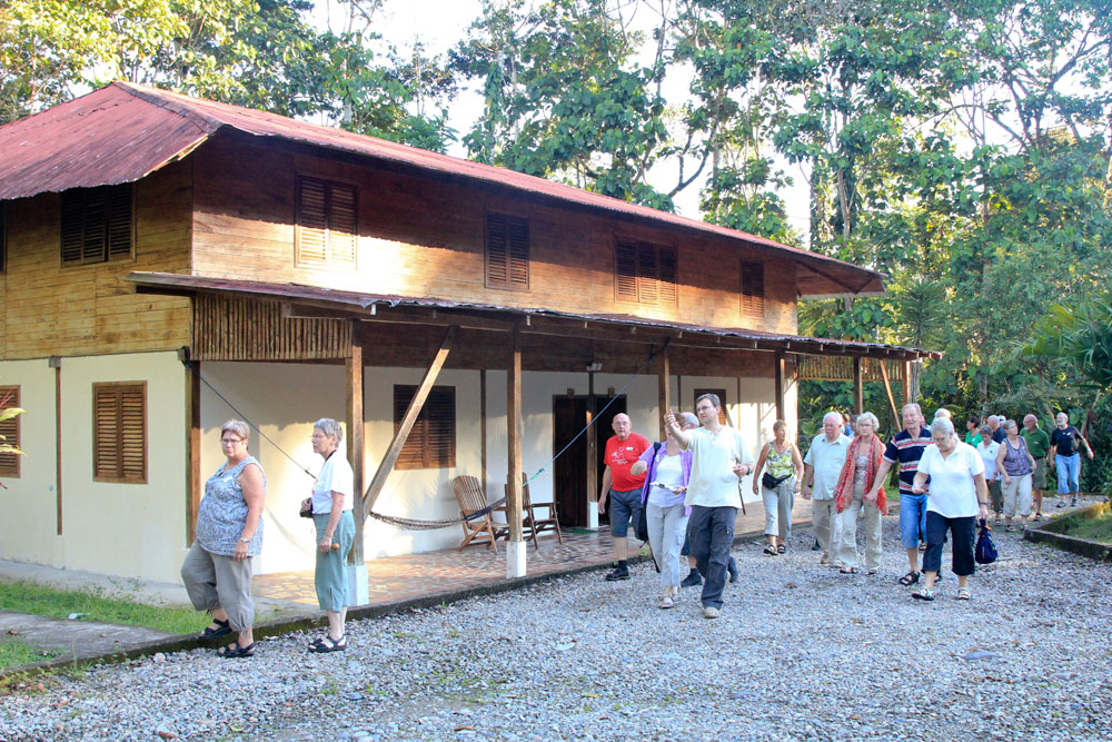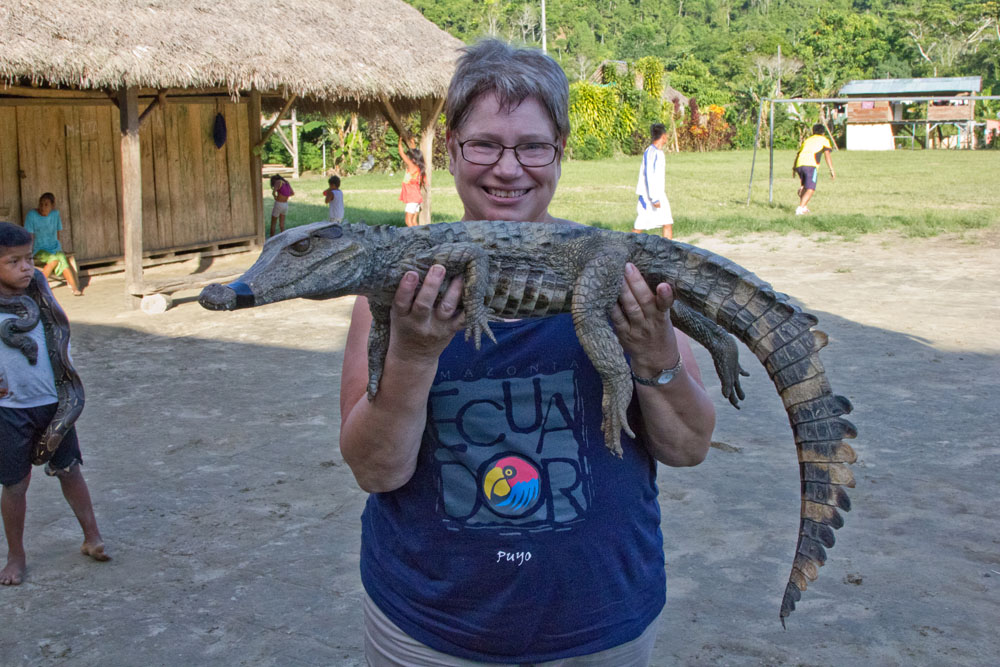 | Ecuadorianerne gerne ville have vildsvin til jul og andre højtider. Det betyder, at junglesvinene er truede, derfor er sanatoriet begyndt at opdrætte vildsvinene og sælge dem til lokalbefolkningen. Junglesvinene hedder på dansk Halsbånds Peccary | En dame havde købt en lille Ocelotkilling, den var jo så kær. Men da ocelotten blev voksen og damen var taget på arbejde, havde ocelotten, der var en han, afmærket sit territorium i hele huset, hvorefter det var umuligt for damen at komme ind i hendes hus igen, fordi ocelotten pludselig ville beskytte sit territorium. Derfor var den blevet placeret på sanatoriet | Når vanddybden var for lille blev motoren løftet delvis ud af vandet. Så længe det gik på den måde, kunne vi også blive siddende i kanoen |