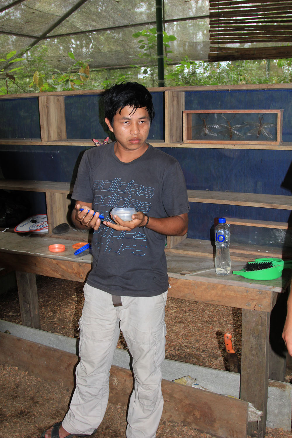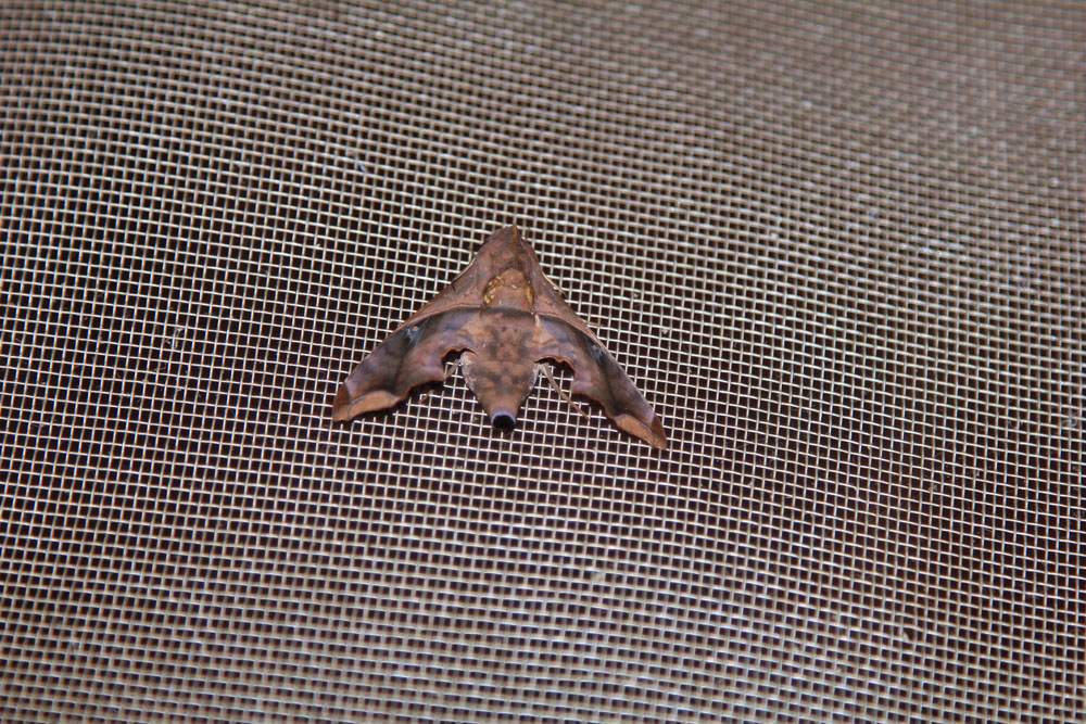 | Her skulle vi så bo på 1. sal | Afslapning med en stille øl, foran vores værelsesfløj. Øl købte vi i bussen, men det vi drak til maden blev købt på lodgen | Da lyset blev tændt på værelserne, var der mange forskellige insekter, der gerne ville ind til os, her er det en natsværmer der er "fanget" på mosquitonettet |