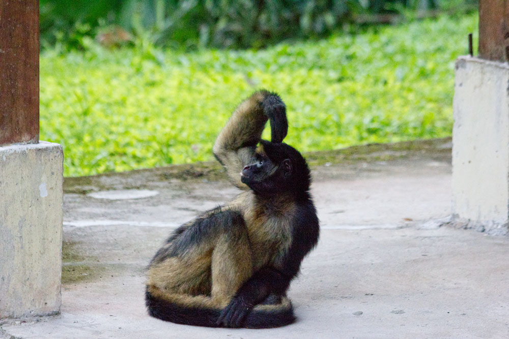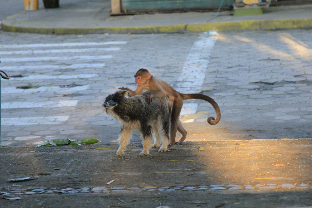 | En Kapucinerabe legede med en Ruhåret Foxterrier | Misahualli, den nærmeste by ved El Jardin Aleman | Torsdag 8. november. Det var svært at få sin morgenmad i fred, her er det en Ara, der vil dele med Vibeke |