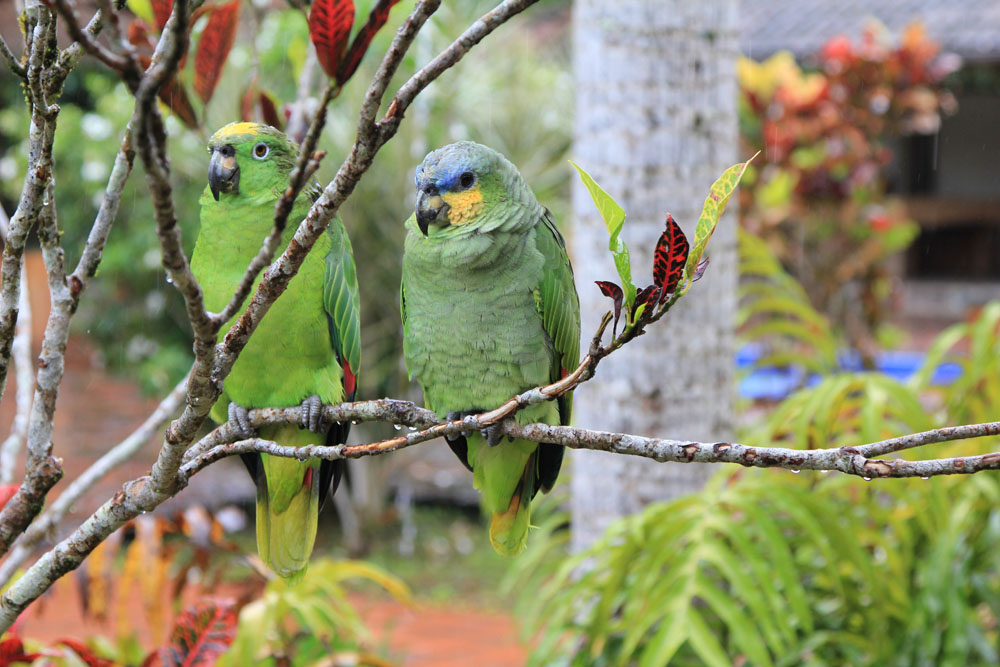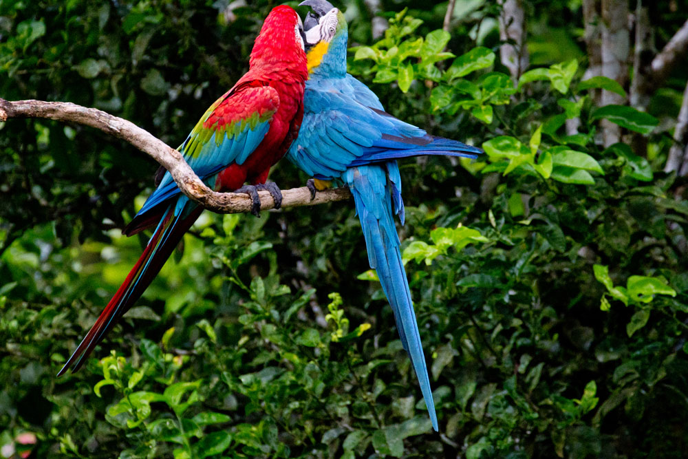 | Onsdag 7. november. På lodgen boede en Edderkoppeabe, som de kaldte Erik. Han var mest aktiv om morgenen | Masked Crimson Tanager - Ramphocelus nigrogilaris | En Mørkerød Ara og en Blågul Ara, der hygger sig |