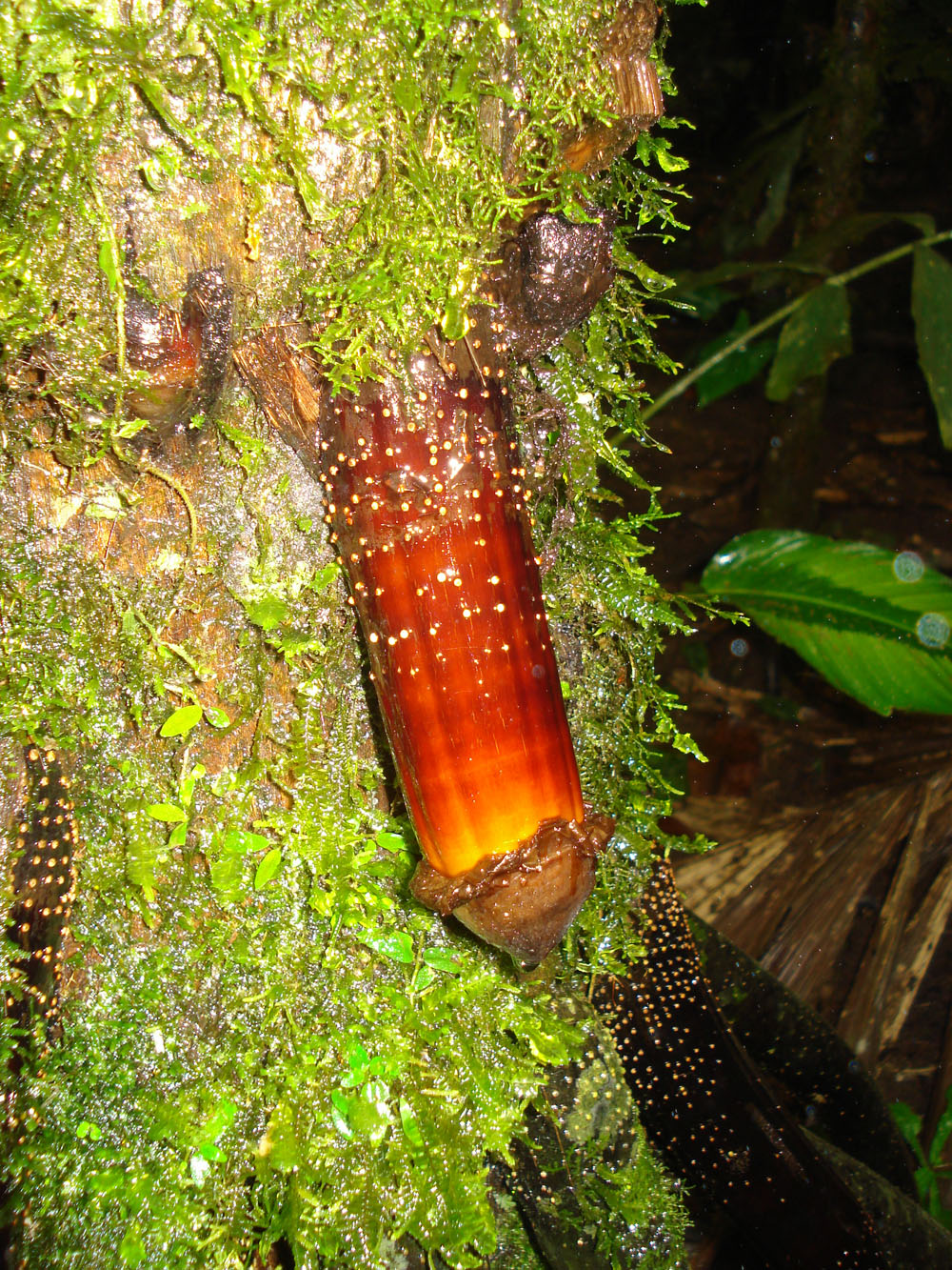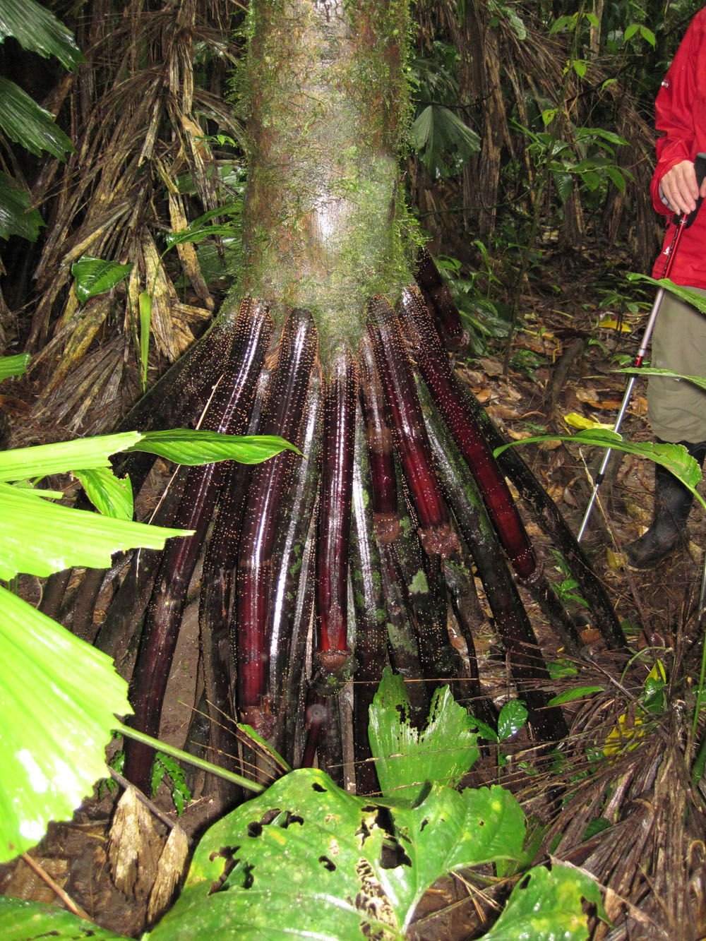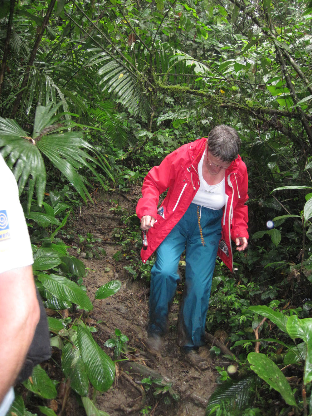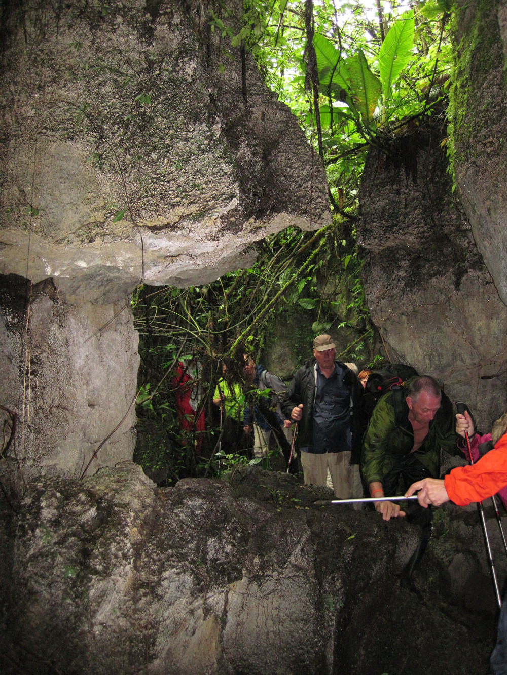 | Det var ikke hele tiden, vi gik på stier med jungle til begge sider, vi forcerede også klippeformationer i regnskoven | På et tidspunkt måtte vores guide, Byron, i gang med macheten for at fjerne noget bevoksning, der var faldet ned over "sporet" | At vi var i en regnskov oplevede vi på flere måde, det regnede det meste af dagen, hvilket medførte at gummistøvlerne sank godt og grundigt ned i undergrunden |