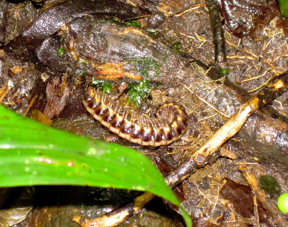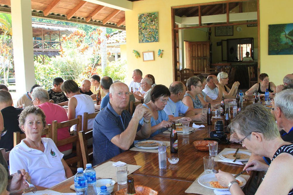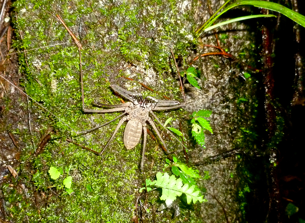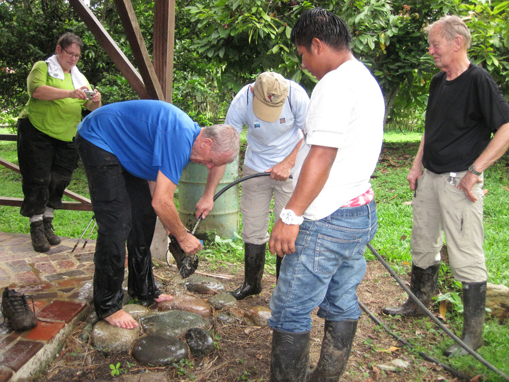 | Hvis man venter at møde en mængde dyr, når man vandrer i regnskoven, bliver man skuffet. Det vi så var mest, hvad de fleste kalder kryb, her er det en Scorpionsedderkop | Hjemme igen stod det på støvlevask | Vel fortjent frokost |