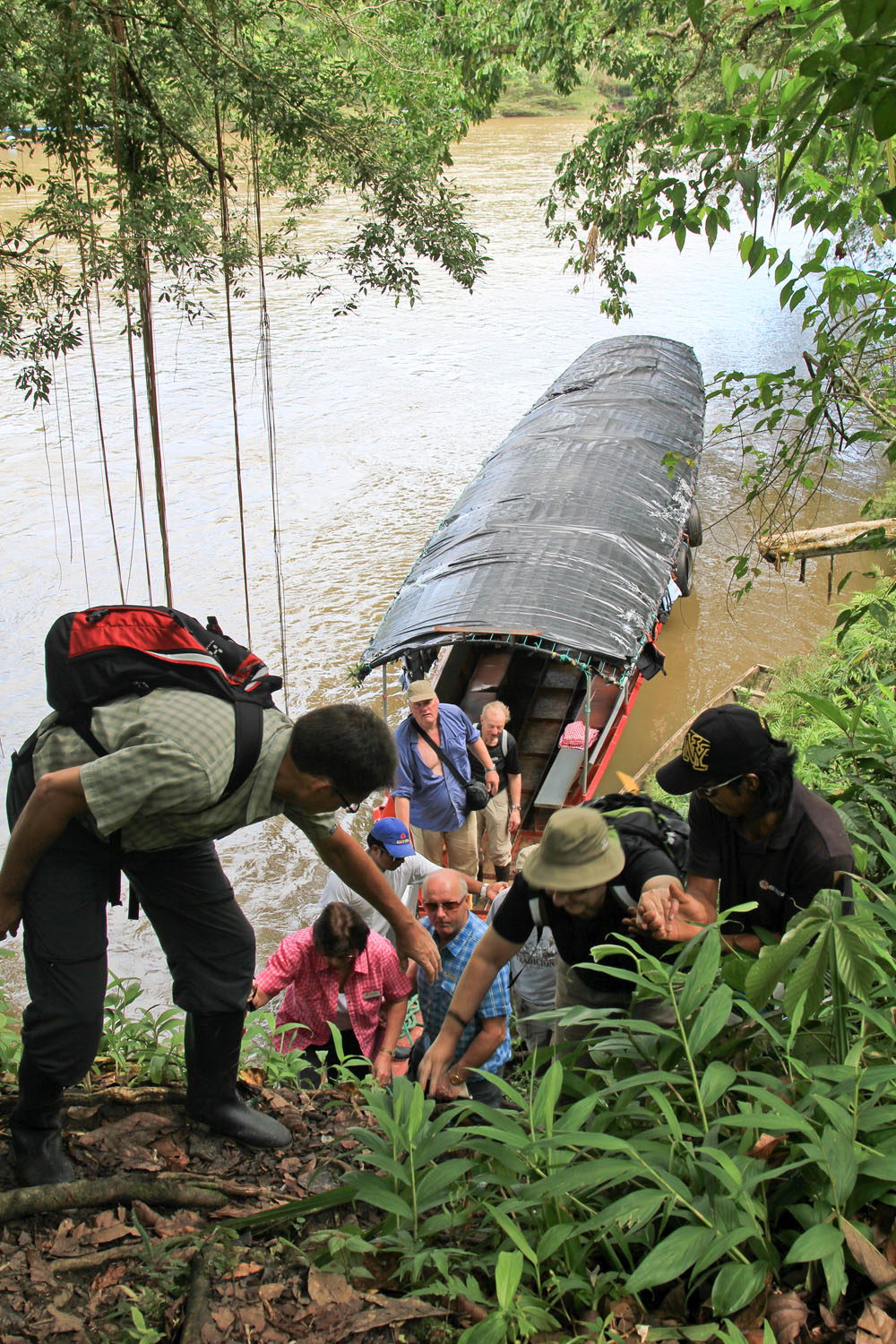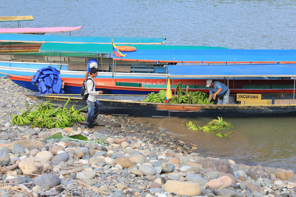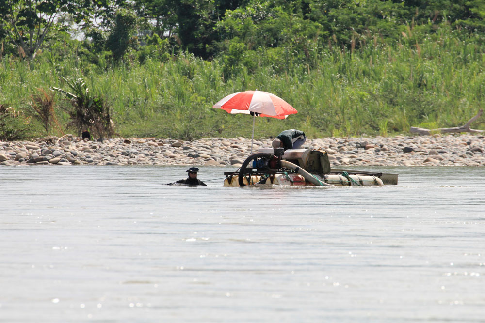 | Vi skulle ud at sejle på Napo River. Udskibningen skulle foregå fra Misahualli. Vi samlede vores bagage sammen og gik ned til floden til de "motoriserede kanoer" | Der var "guldgravere" langs floden, dvs. de vaskede mere end de gravede. Minimumslønnen i Ecuador var ca. 150 $ pr. uge, guldgraverne kunne tjene omkring 300 $ pr. uge, måske mere, men hvor meget mere var en hemmelighed | De motoriserede kanoer havde halvtag over det var dejligt, idet det skærmede for solen |