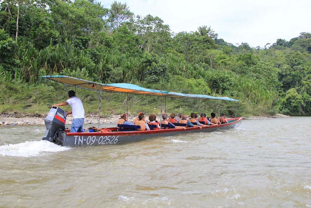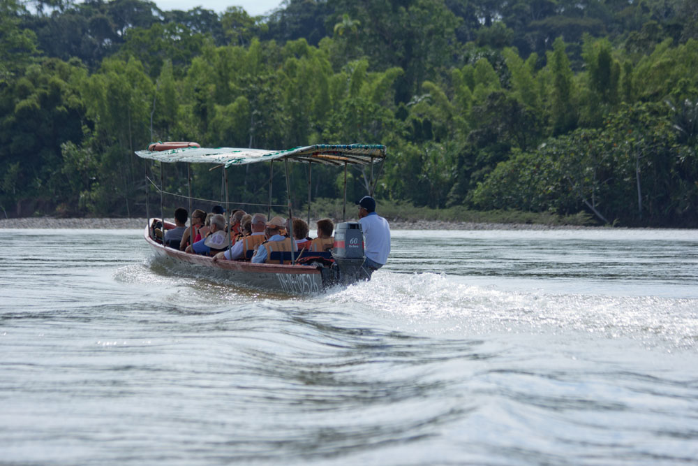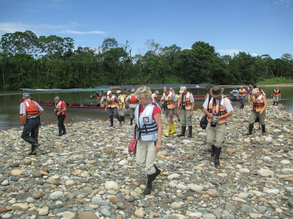 | Napo floden på denne årstid er ikke sådan lige at forcere. Når der ikke er vand nok under kølen, hjælper nok så mange hestekræfter ikke. I de situationer blev vi sat af på en af stenbankerne, hvor vi så vandrede ned langs floden, indtil båden igen var på så dybt vand, at vi også kunne være i båden | Landgang ved et rekreationshjem for sårede og "udstødte" vilde dyr | Cuvier's Tucan - Ramphastos cuvieri |