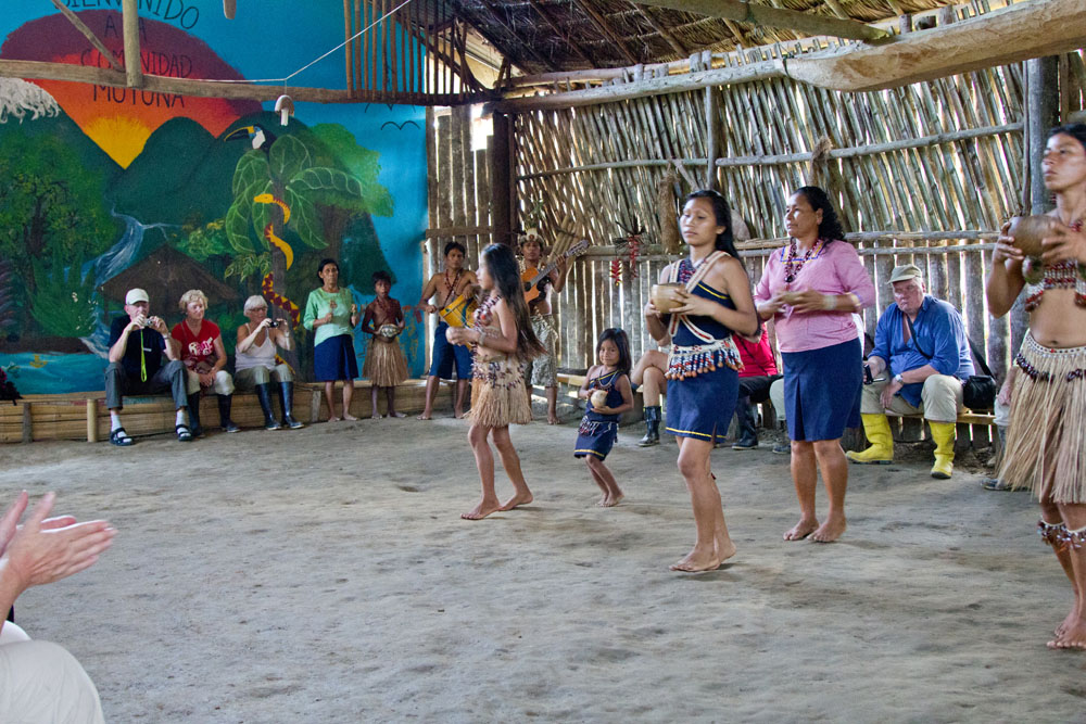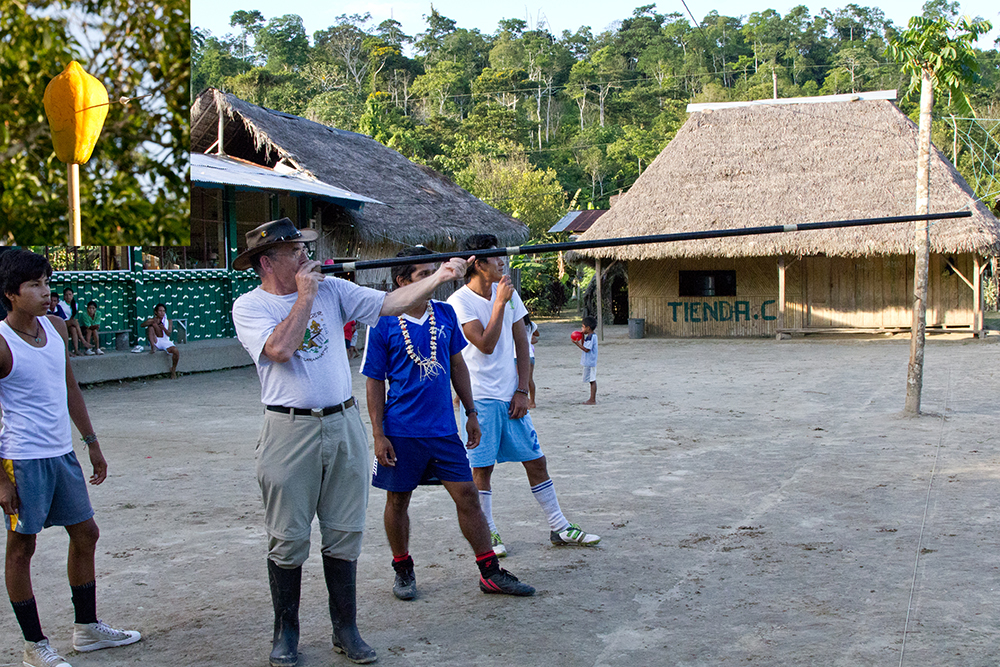 | Efter øldrikningen kom nogle musikkere og en dansetrup på gulvet. Først lavede de en demonstration. Derpå blev vi budt op til dans | Efter dansen var der fotosession, dvs. vi kunne få lov at holde en Kajman, som havde mundkurv på. Selvfølgelig mod betaling af 1 $ for hver gang vi stillede os op foran et kamera | Der blev stillet en papaya op på en stang, hvorefter de landsbyens beboere udfordrede os til at prøve at skyde med pusterør. Den eneste, der ramte, var én af landsbyens unge mænd |