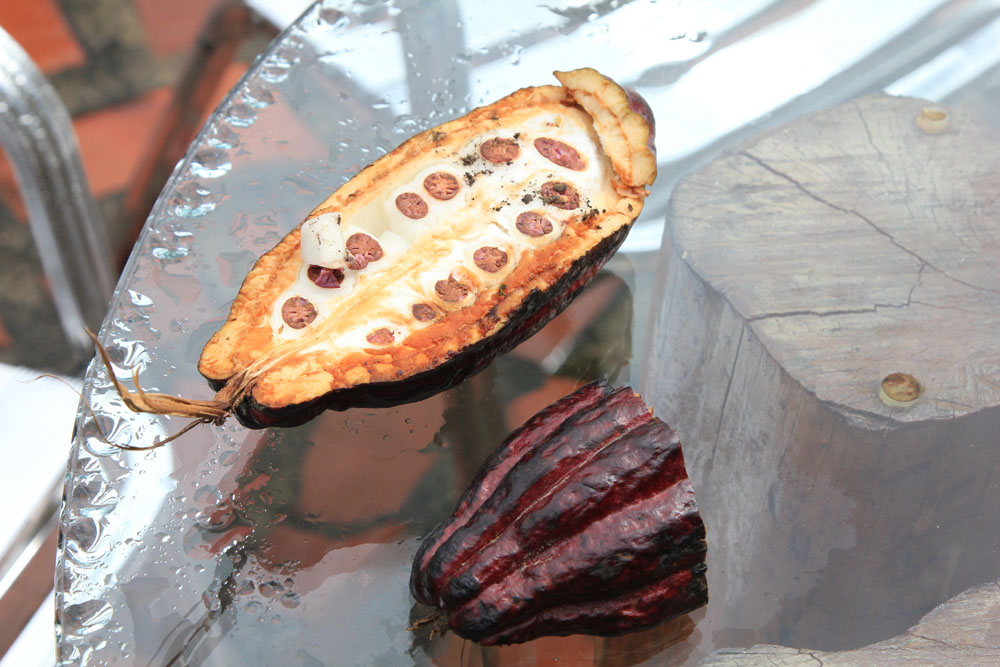 De Gulissede Amazonpapegøjer sad og pustede sig op i regnen | En kakaofrugt er skåret over. Det hvide "kød", der omslutter kakaobønnerne, er noget klæbrig blødt væv |