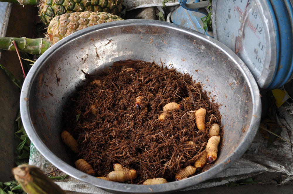 | Vibeke med en sommerfugl på hånden | På markedet i Tena var der selvfølgelig muligt at shoppe, hvis vi havde lyst. En af specialiteterne var nogle larver, som de lokale stegte og spiste, de var meget proteinholdige. Mauro afslørede, at han ikke brød sig om at spise dem, men der var mange der spiste dem |