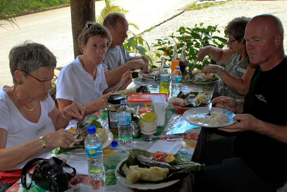 Næste stop var frokostpausen ved Paradero los Petroglifos - det betyder egentlig "Stoppestedet ved helleristningerne". Helleristninger så vi ingen af, men maden var glimrende. Hovedretten var Matio de Tilapia. Tilapia er en karpefisk, som man dyrkede i nogle damme neden for "restauranten". Fiskene blev pakket ind i bananblade |