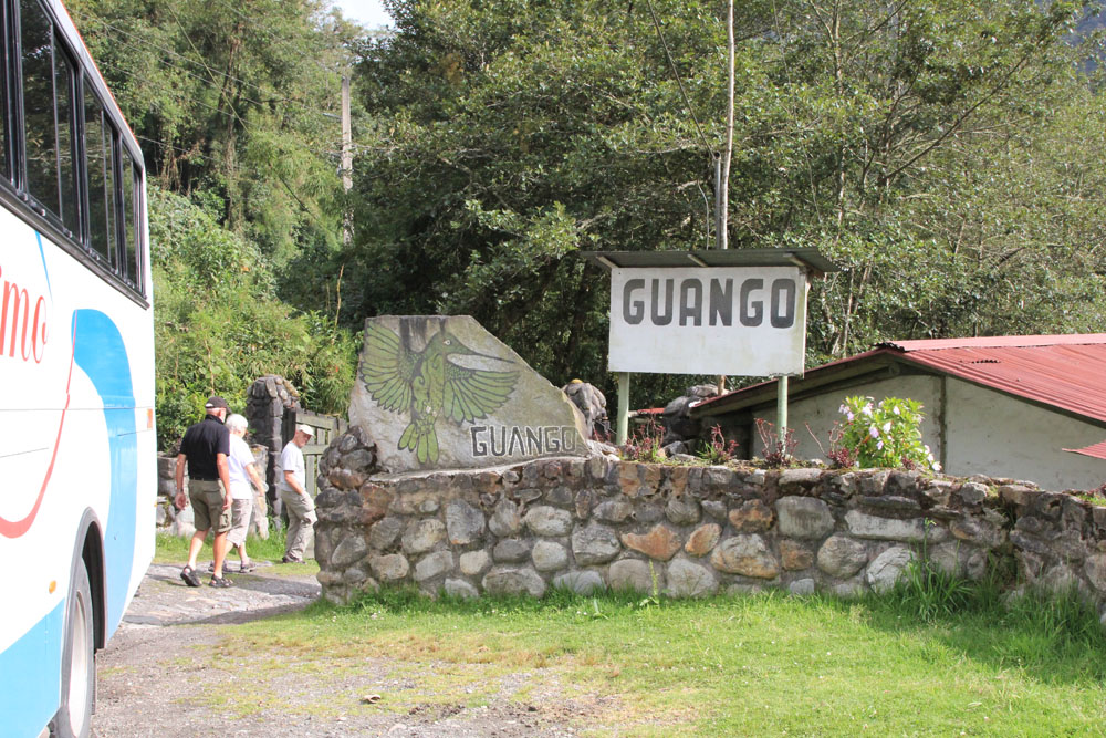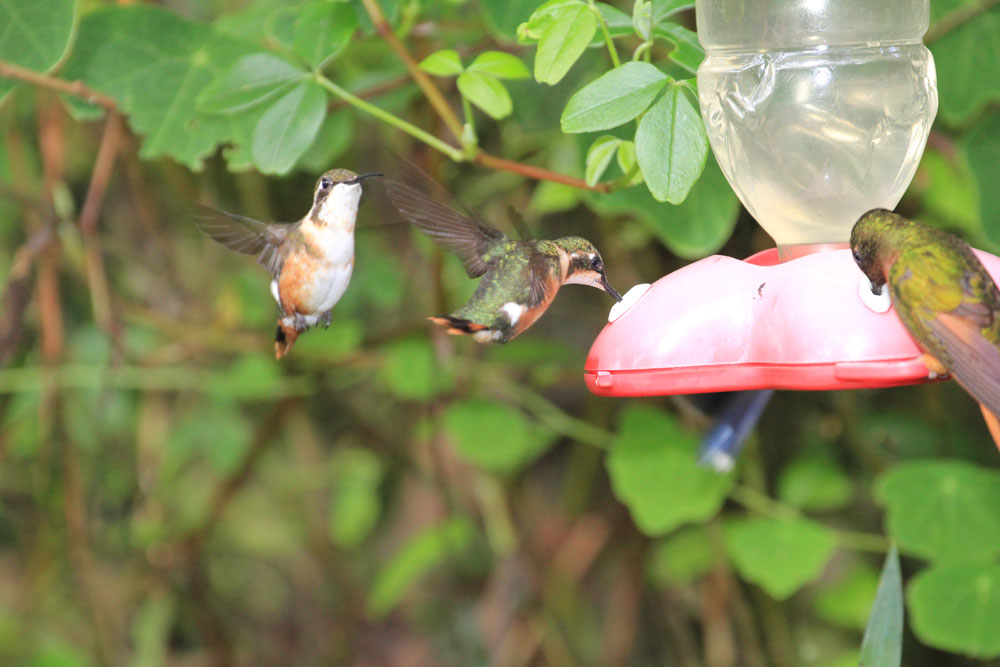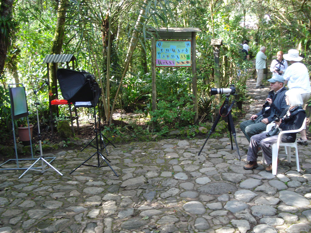 | En gård, hvor man fodrede colibrierne, således at der var mange at se på stedet | Sværdkolibi - Sword-billed Hummingbird - Ensifera ensifera | Så var der amerikaneren med det dyre udstyr, som blot sad på sin stol med fjernudløseren i hånden og ventede på, at en kolibri skulle flyve hen til den blomst, han havde fået smurt ind i sukkervand. Han skiftede end ikke selv blomsten ud, det havde han folk til |