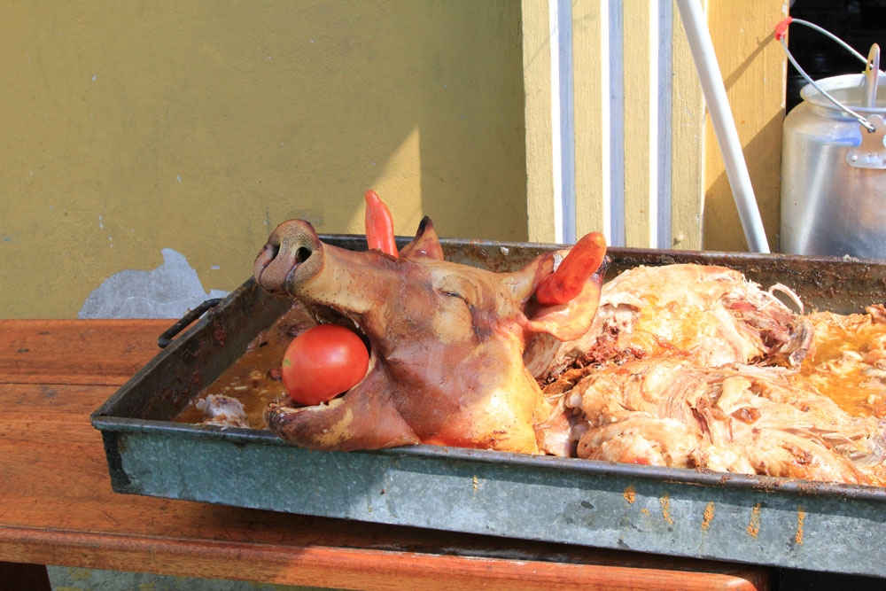 | På markedet var der både mange fristelser og meget at se på | Frokosten blev indtaget på Hotel El Indio Inn | Hele stegte grise var til salg på kødmarkedet |