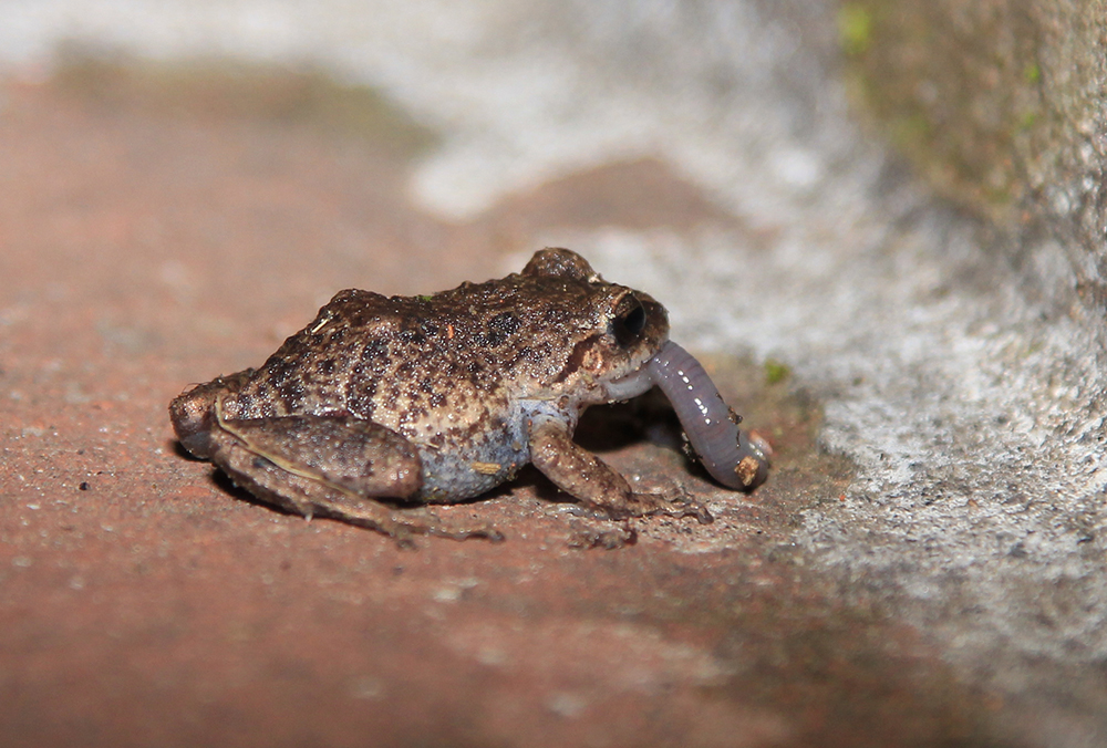| Vandfaldet Peguche | Casa Mojanda ved nattetide | Mange aftener havde vi hørt kliklyde fra buskadset. Mauro fortalte, det var frøer, der sad i træer og buske. Både i regnskoven og andre steder havde vi forsøgt at finde dem, denne aften var der pludselig en på vores trappe |