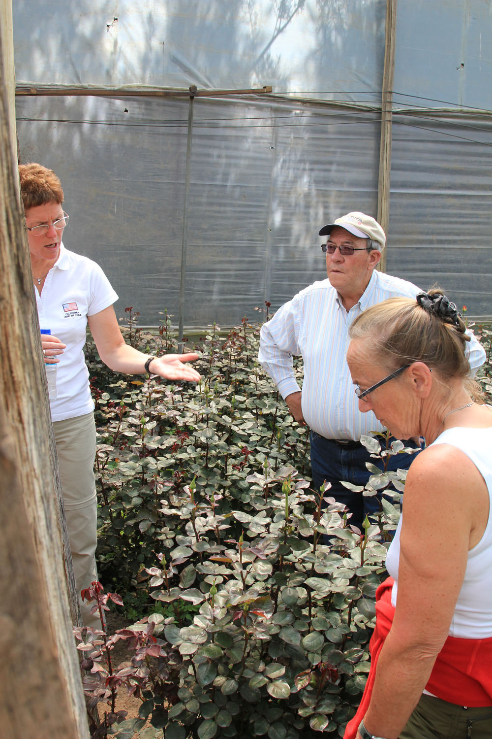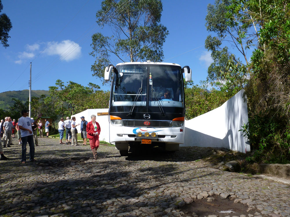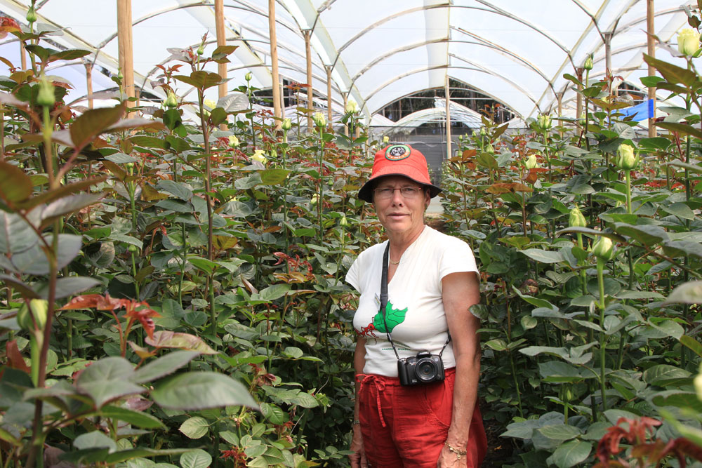 | Mandag 12. november. Det var blevet tiden til at tage afsked med Betti. Chaufføren mente ikke, at bussen kunne trække både os og bagagen op nede fra hotellet, så efter bussen var læsset, vandrede vi op på vejen og ventede på at bussen kom op | Ejeren fortalte, at grunden til, at det er så godt at dyrke roser i Ecuador, er fordi solen står lige over dem hele tiden. Så er det man spekulerer på, om solen ikke står op og går ned over hans drivhuse | Langstilkede var roserne, det kunne man se, når man gik ind i rækkerne. Over 95% af de roser, vi køber i Danmark, kommer fra Ecuador |