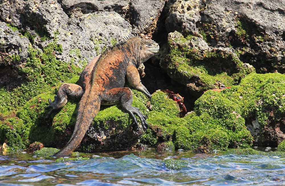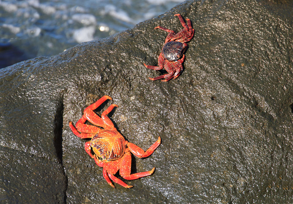 | Sally LetPåTå krabberne - Sally Lightfood krabberne - Grapsus grapsus. Det nye navn for krabberne er egentlig Rød Lavakrabbe. De findes andre steder i troperne, men ikke i så stort et antal som på Galapagos. De er sorte, når de er små | Ved havnen så vi vores første Havleguan, det var en lille hun - Marine Iguana - Amblyrhynchus cristatus, denne var omkrig 75 cm lang. De kan blive op til 150 cm. Hvis man læser ca. 100 år gamle danske biologibøger, hed den en Haviguan | Vi vandrede op til et udsigtspunkt og så hvorledes farverne skiftede i landskabet, mellem det kultiverede landskab og den oprindelige galapagosnatur |