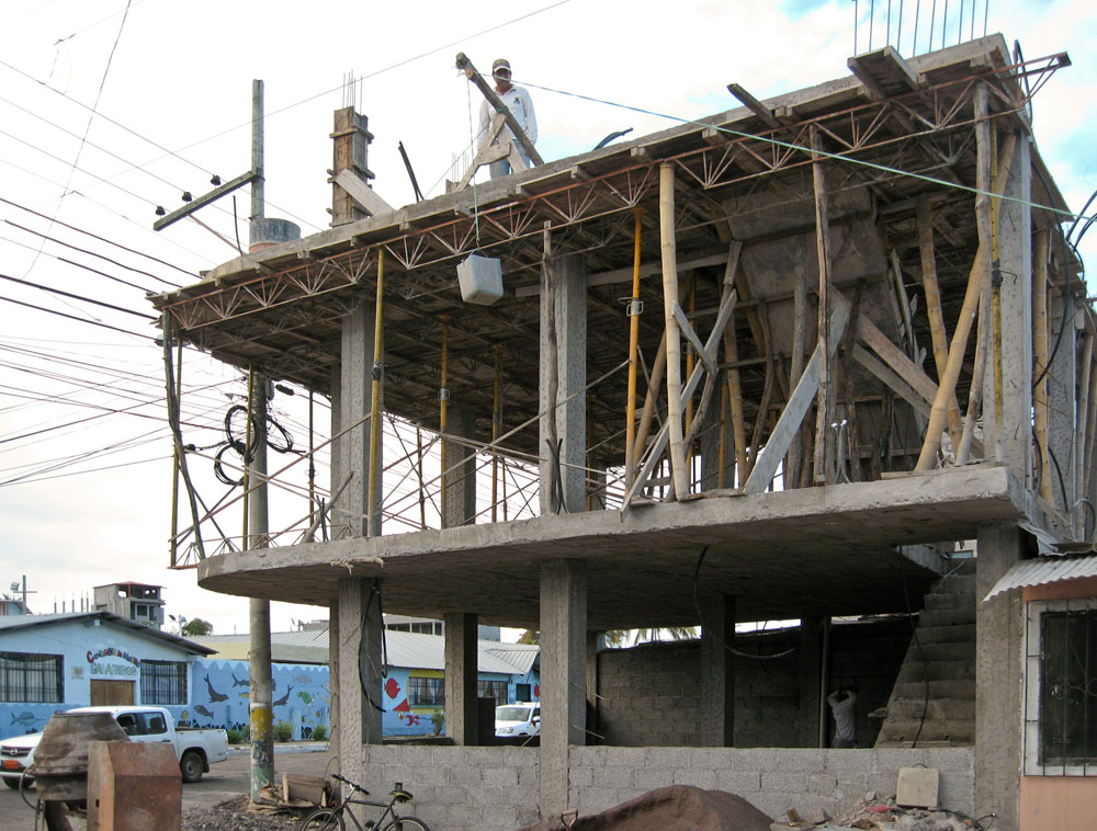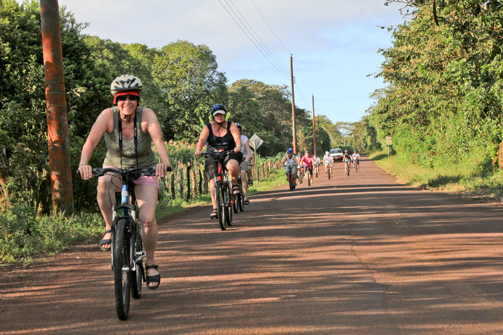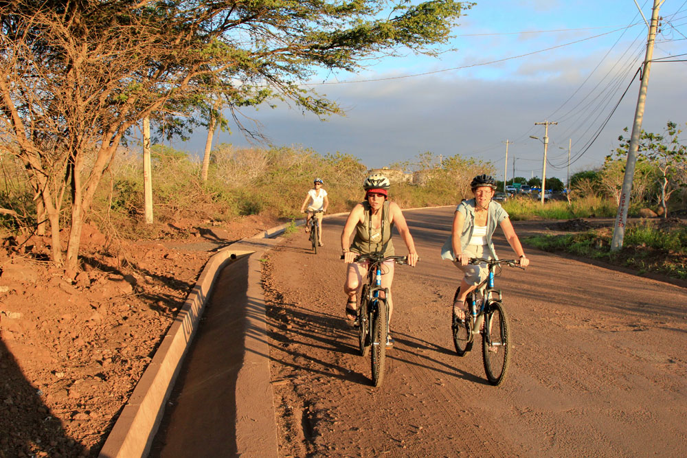 | Grå Sangfinke - Gray Warbler Finch - Certhidea fusca | Cyklerne på San Christobal var af en meget bedre kvalitet end dem vi havde fået i Ecuador, men vejene var meget mere hullede på San Christobal, så det var med at have øjenene på vejen hele tiden | Det "store stop" på cykelturen var ved et trætophotel |