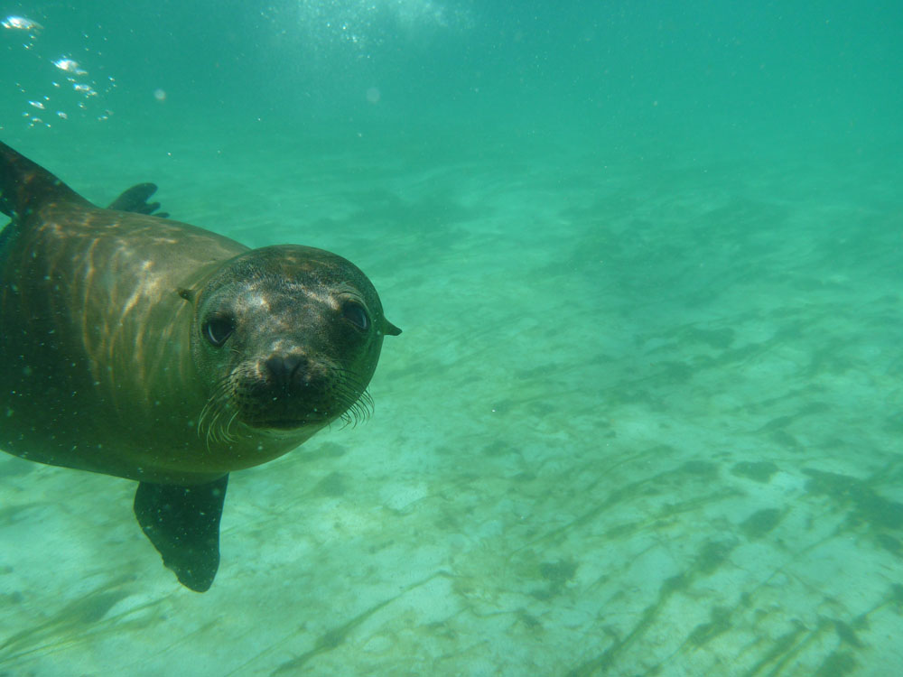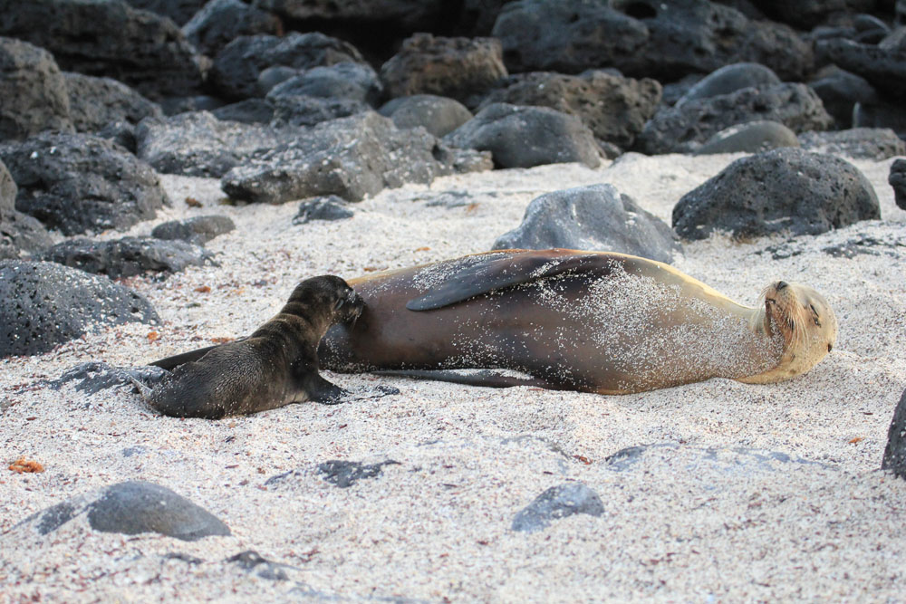 | Efter ca. 17 km cykeltur ankom vi til kysten, vi var egentlig blevet sat i udsigt, at vi skulle ud at bade, men solen var ved at gå ned, da vi ankom, så vi afstod fra at hoppe i vandet | Det var en strand, hvor der var mange søløver. Her er det en hun med sin lille unge, den får lidt mælk | Når solen går ned bliver temperaturen dejlig |