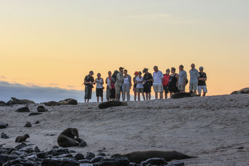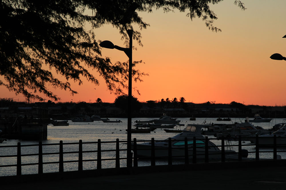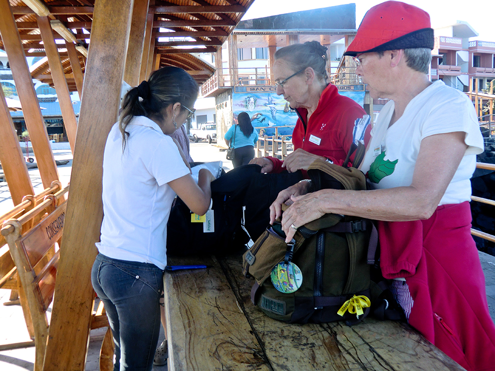 | Solnedgang over San Christobal | Torsdag 15. november. Vi gør klar til at forlade San Cristobal | Før vi fik lov at forlade San Cristobal, skulle vores bagage undersøges, vi måtte ikke have noget med, der kunne forurene den næste ø |