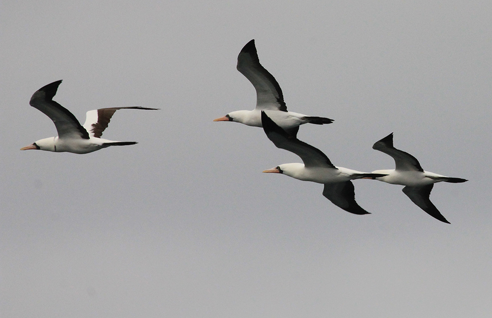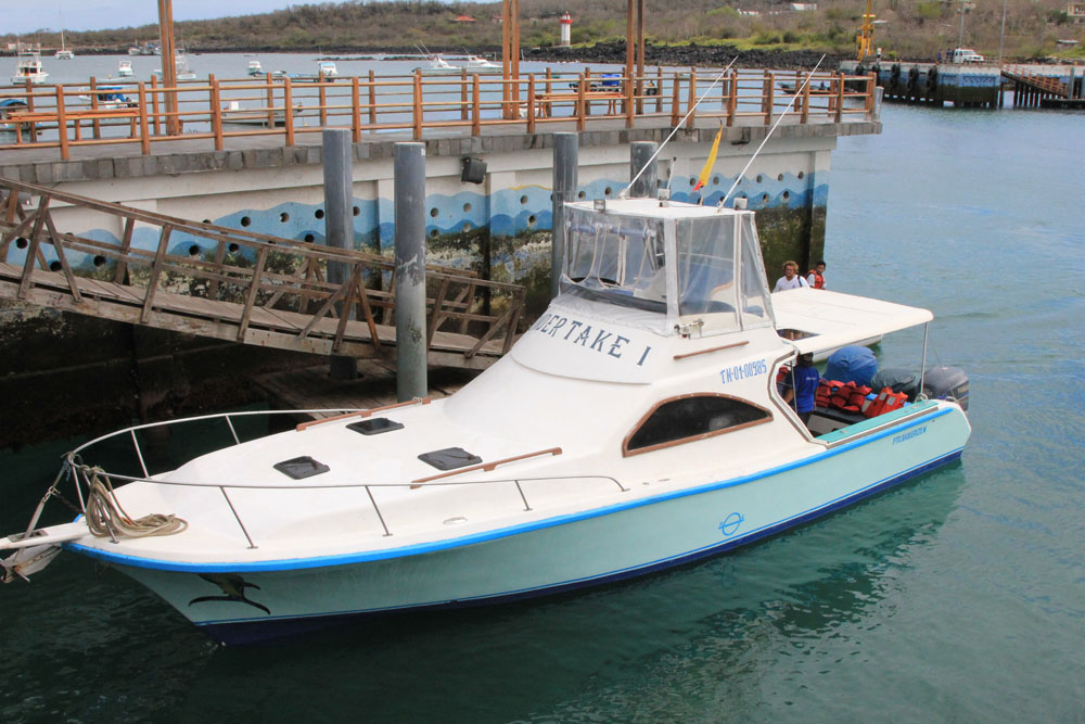 | Den ene af bådene, der skulle bringe os fra ø til ø, er ved at blive gjort klar. Den hed Undertake I. Vi fik 2 af den størrelse, der kunne være 16 mand i hver. De blev drevet af 3 styk 200 hk påhængsmotorer | Da vi var kommet om bord, blev sikkerhedsregler og almindelige forholdsregler, for at være ombord på båden, gennemgået | Maske Sule - Masked Boobie fløj hen over vores båd |