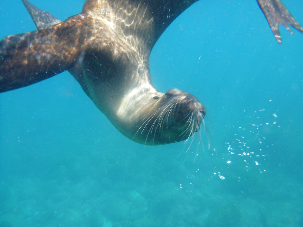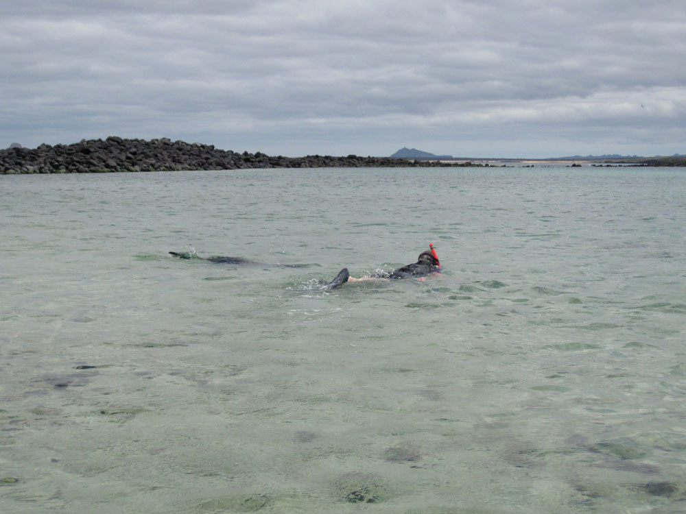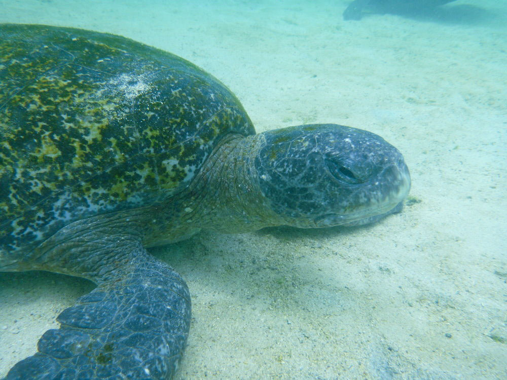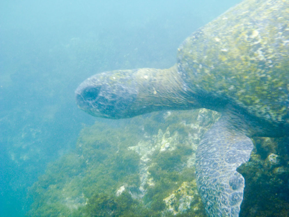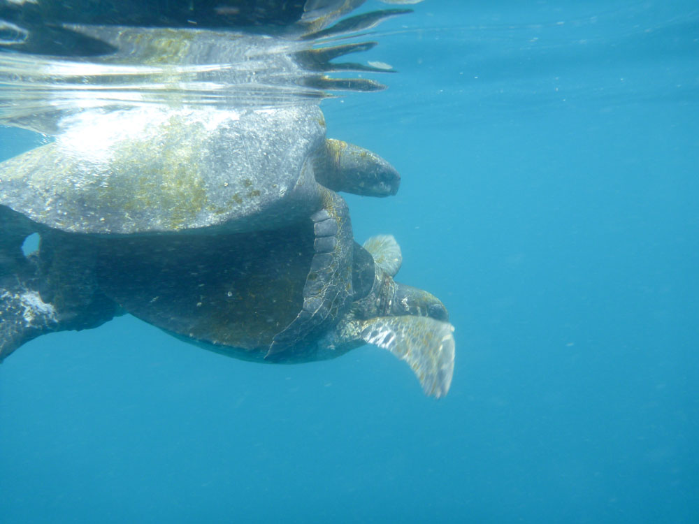 | To havskildpadder er ved at parre sig | Vibeke var den sidste til at komme op af vandet, søløverne ville lege med hende, de kendte ikke til sikkerhedsafstanden på 4 m | De alger, som havleguanerne lever af, er lidt forskellige på de enkelte øer. Det skal efter sigende være grunden til, at havleguanerne på Floriana er mere farvestrålende end på de andre øer |