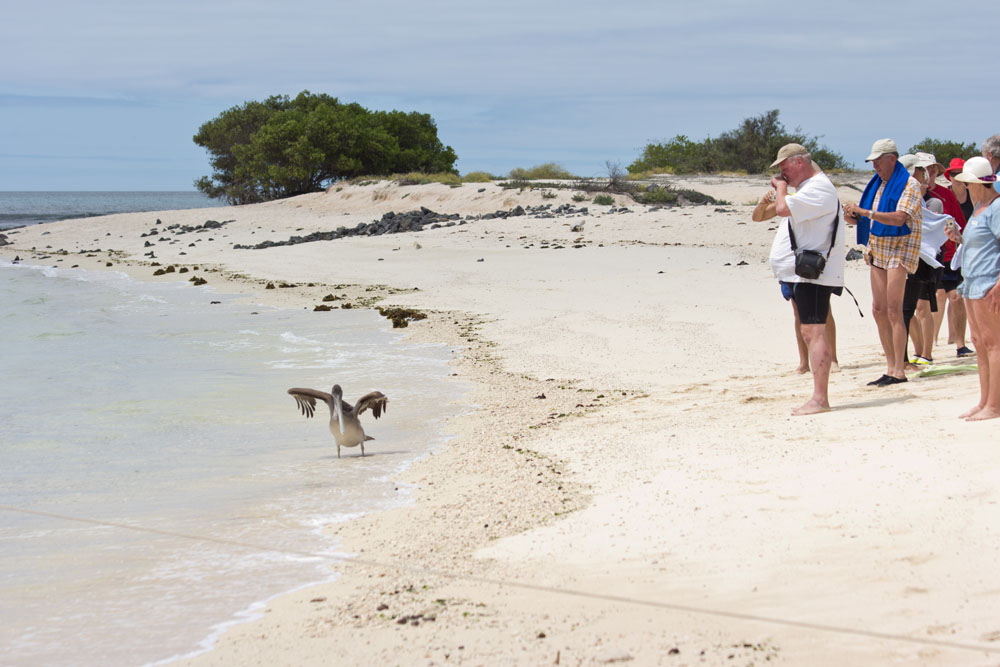 | Der var mange forskellige søpindsvin på klippevæggen, her er det en Green Sea Urchin - Lyctechinus semituberculatus, på billedet det kommer frem ved klik, er det White Sea Urchin - Tripnuestes depressus | På vej til næste oplevelse | Da vi kom i land, var der en brun pelikan, der landede næsten på tæerne af os |