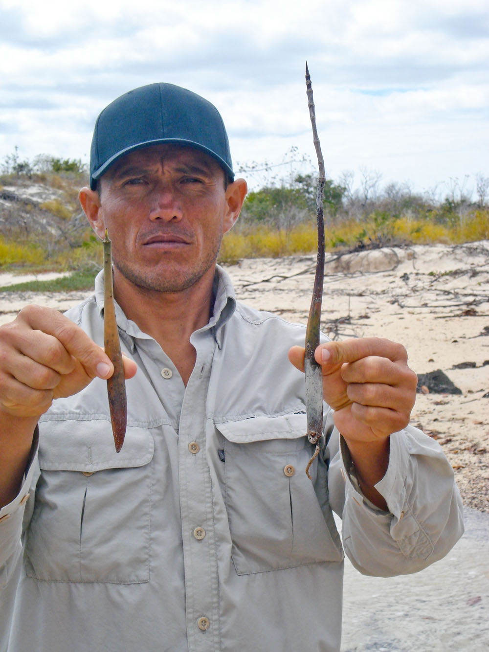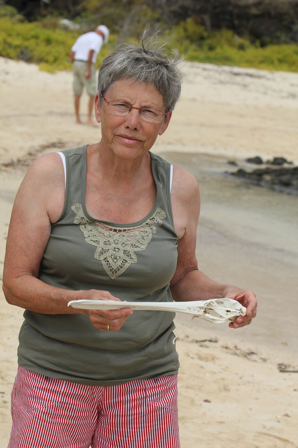 | Pablo fortalte om, hvordan det røde mangrove træ formerer sig. På Galapagos øerne findes 2 arter af mangrove, det er Red Mangrove og White Mangrove | Der findes 3 arter af lavafirben på Galapagos, her er det et San Cristobal Lava Firben | Vibeke fandt et kranie af en Pelikan. På det kunne vi rigtig se den skarpe krog, der er på spidsen af pelikanernes næb |
